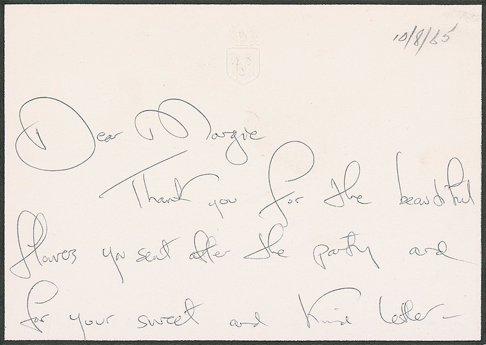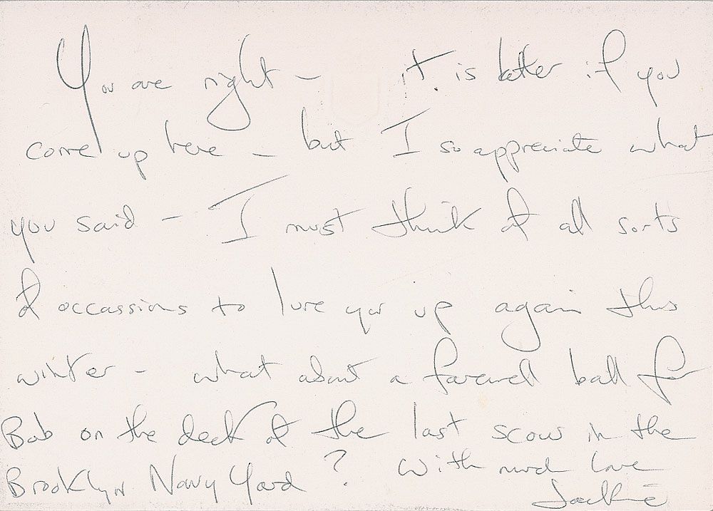ALS signed “Jackie,” one page both sides, 5 x 3.5, black-bordered blind embossed JFK coat of arms letterhead, dated in pencil at the top October 8, 1965, most likely by the recipient. Letter to John F. Kennedy’s Secretary of Defense Robert McNamara. In full: “Thank you for the beautiful flowers you sent after the party and for your sweet and kind letter—You are right—it is better if you come up here—but I so appreciate what you said—must think of all sorts of occasions to lure you up again this winter—what about a farewell ball for Bob on the deck of the last scow in the Brooklyn Navy Yard?” In very fine condition. Letter originates from the estate of Robert S. McNamara.