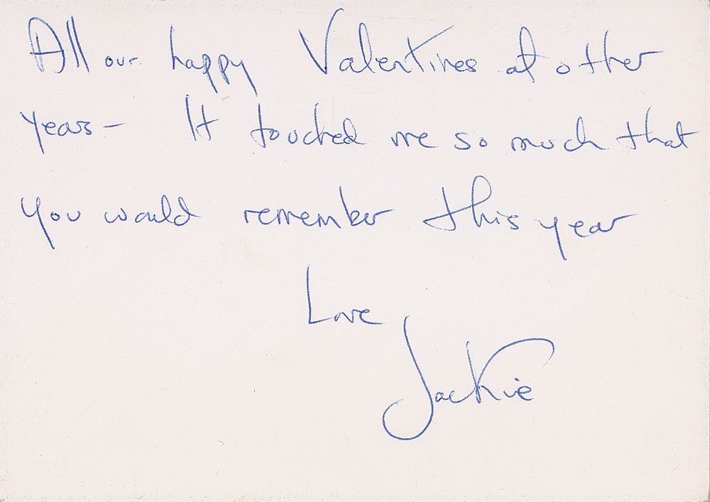 ALS signed “Jackie,” one page both sides, 5 x 3.5, black-bordered personal letterhead, February 16, 1964. Letter to John F. Kennedy’s Secretary of Defense Robert McNamara. In full: “I do thank you for your faithful Valentine—and for the lovely flowers. All our happy Valentines of other years—It touched me so much that you would remember this year.” In fine condition. Letter originates from the estate of Robert S. McNamara.