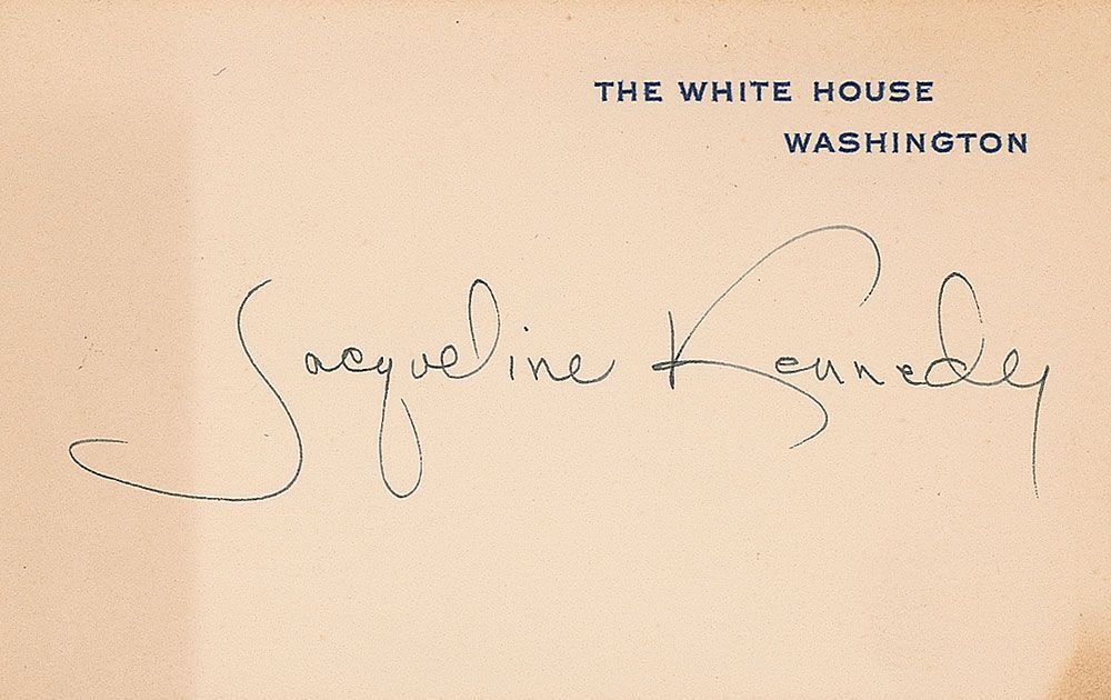White House card crisply signed in black ink, “Jacqueline Kennedy.” A thin strip of toning along left side, over portion of first stroke of signature, and a bit of toning to lower right corner tip, otherwise fine condition.