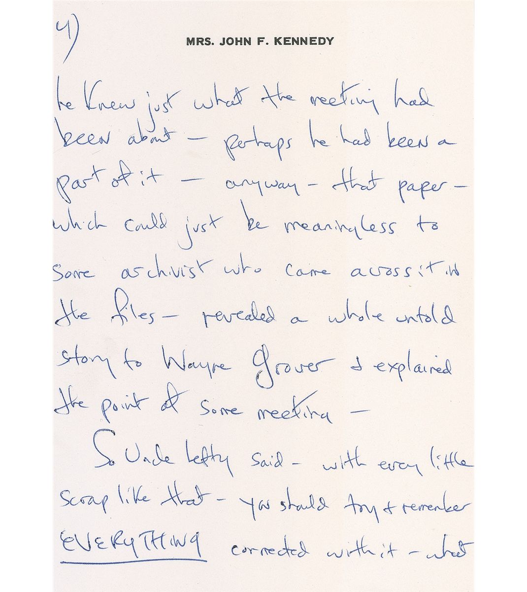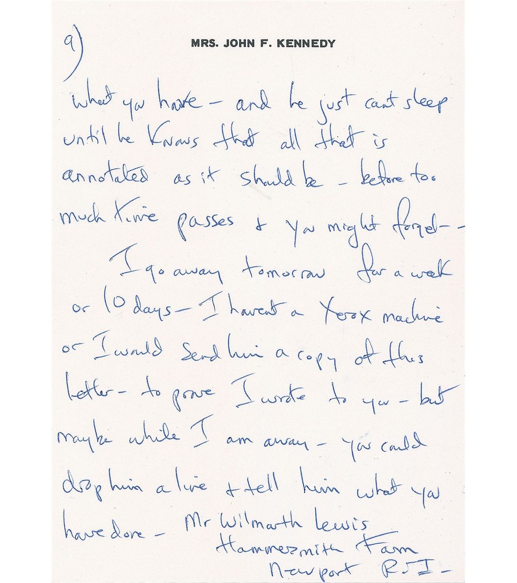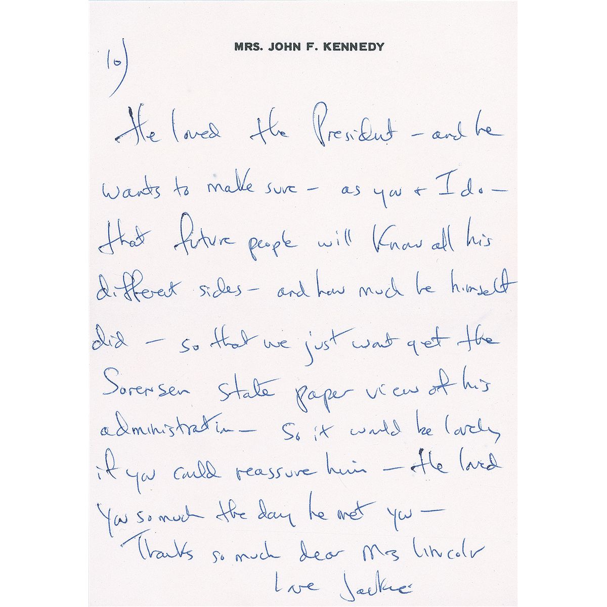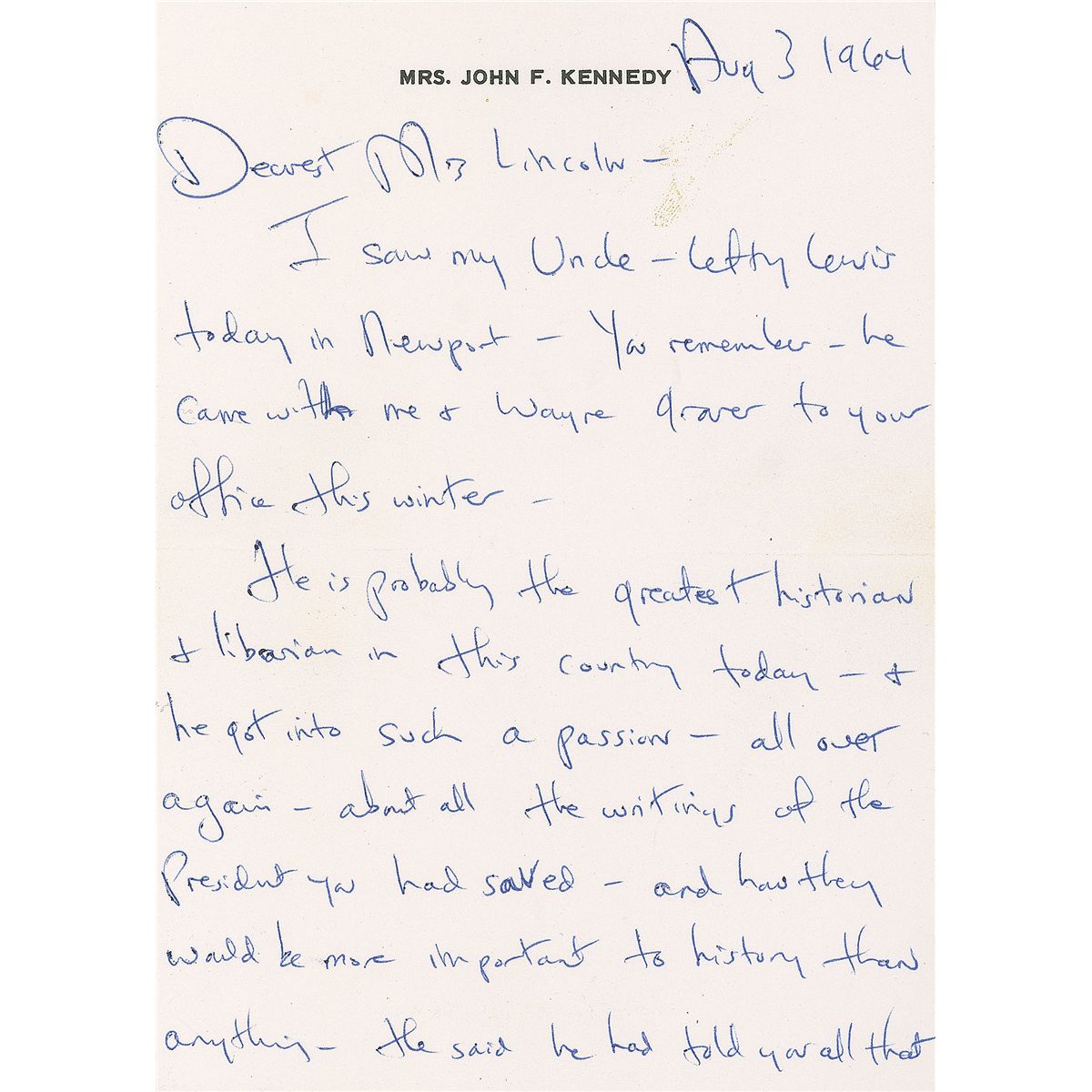 ALS signed “Jackie,” ten pages, 5 x 7, personal letterhead, August 3, 1964. Letter to Evelyn Lincoln, written after seeing her uncle Lefty Lewis, who requested that all of Kennedy’s papers that Lincoln saved be dated, annotated, and locked up. In part: “I saw my Uncle—Lefty Lewis today in Newport—You remember—he came with me and Wayne Grover to your office this winter. He is probably the greatest historian & librarian in this country today—& he got into such a passion—all over again—about all the writings of the President you had saved—and how they would be more important to history than anything—He said he had told you all that and of course you know it now—But he wouldn’t let me out of his sight until l had promised to write you—to make sure that you date every one—which you can do from the Presidents appointment books.