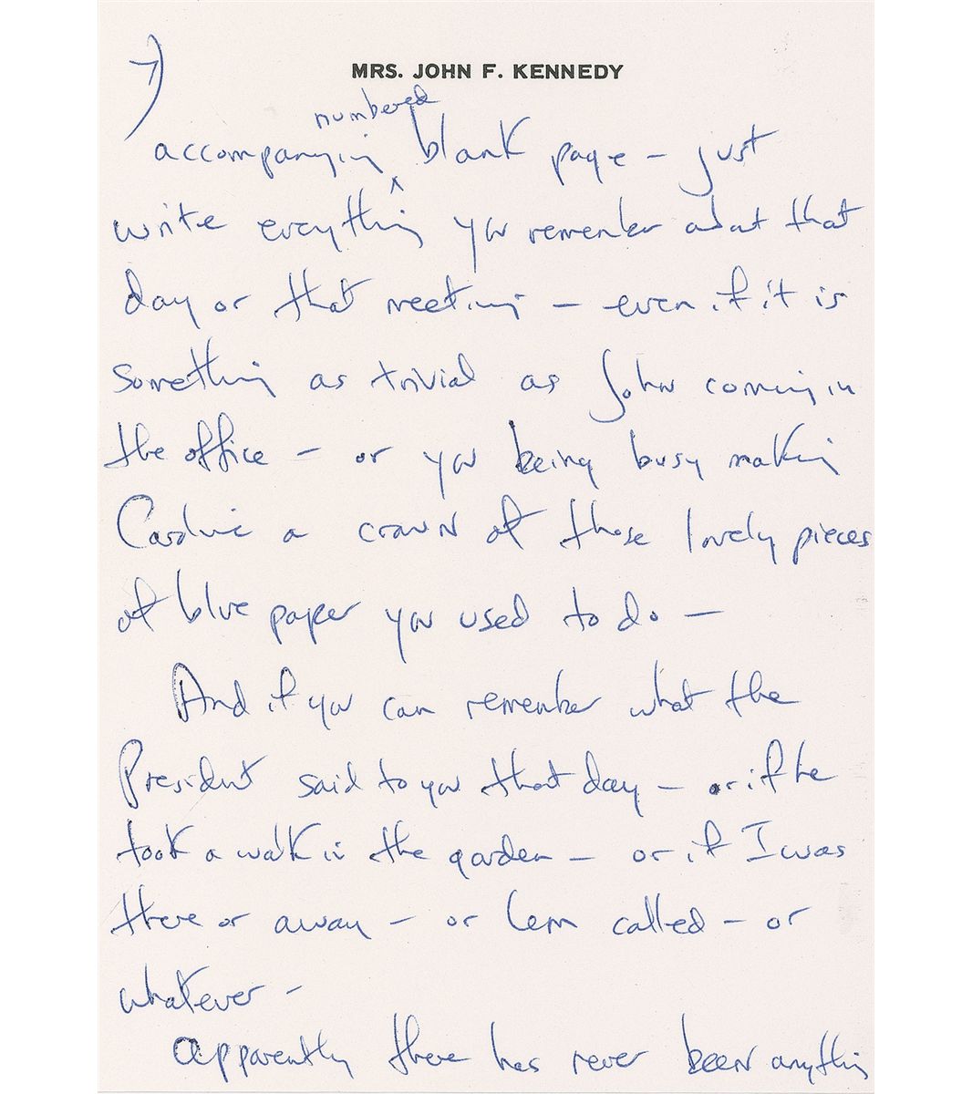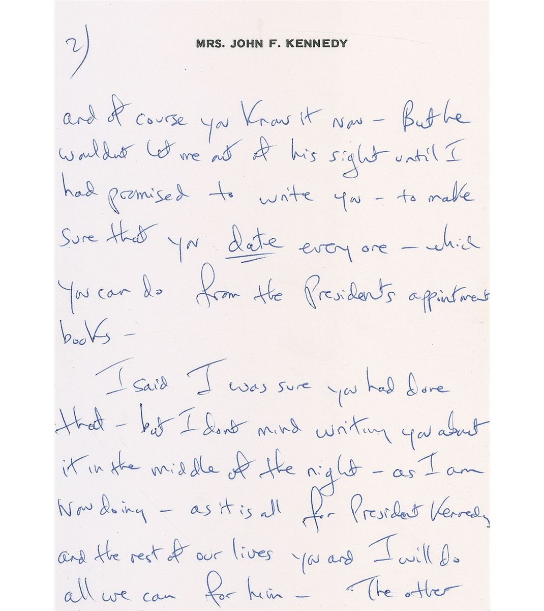 The relationship between JFK and Evelyn Lincoln, the devoted personal secretary who served him from the day he entered the Senate to the day he was assassinated, was one of the most important in the president’s life—and, as emphasized by Jackie, one of the most important in the world’s understanding of him. Building his schedule and handling his personal tasks, Lincoln was by Kennedy’s side every day that he was in office, and joined his delegation on dozens of historic trips, from Ireland to Germany, Tampa to Dallas. After his assassination, Lincoln was given the president’s personal effects, ordered to clean out the Oval Office of his possessions, and charged with preparing the items for their ultimate destination: the presidential library in Boston. Along the way, she was also allowed to keep hundreds of items for herself, including doodles from important meetings, drawings by his children, pens used to sign significant documents, and his diaries and journals—all of which became invaluable resources in Kennedy research. With Jackie imploring Lincoln to do her due diligence in preserving the vast amount of information in her care for generations to come—“you have just saved such a treasure trove—& only you can decipher it”—this is an extraordinary letter, uniting two of the most important women in the fallen president’s life.