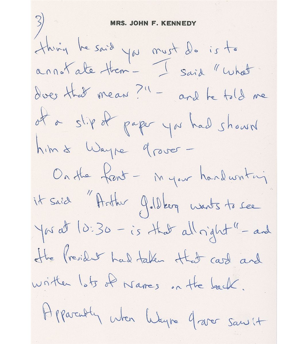 l said I was sure you had done that—but I don’t mind writing you about it in the middle of the night—as I am now doing—as it is all for President Kennedy and the rest of our lives you and I will do all we can for him—The other thing he said you must do is to annotate them—I said ‘what does that mean’?—and he told me of a slip of paper you had shown him & Wayne Grover—On the front—in your hand writing it said ‘Arthur Goldburg wants to see you at 10:30—is that all right’ and the President had taken that card and written lots of names on the back. Apparently when Wayne Grover saw it he knew just what the meeting had been about—perhaps he had been a part of it—anyway—that paper which could be meaningless to some archivist who came across it in the files—revealed a whole untold story to Wayne Grover & explained the point at some meeting—So Uncle Lefty said—with every little scrap like that—you should try & remember EVERYTHING connected with it—what the President was doing that day—who he saw before during & after he wrote it—who was at the State Dinner—what the President was doing that day—whom he saw before dinner & after he wrote it—who was at the State Dinners where he scribbled speeches on menus etc.