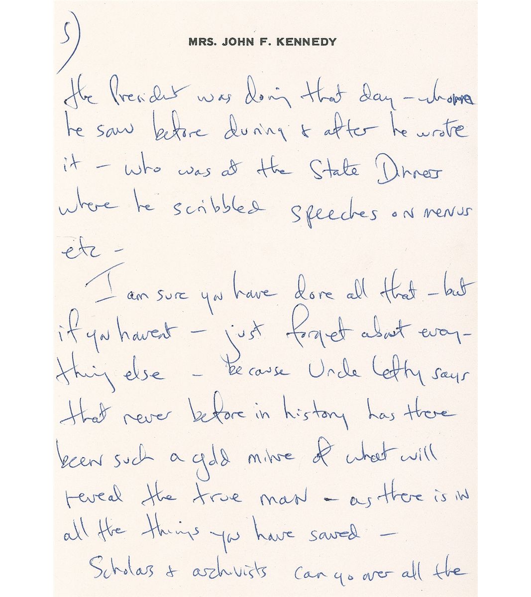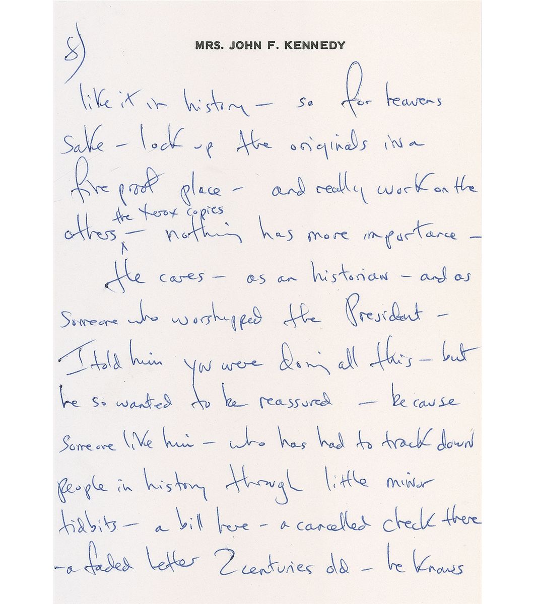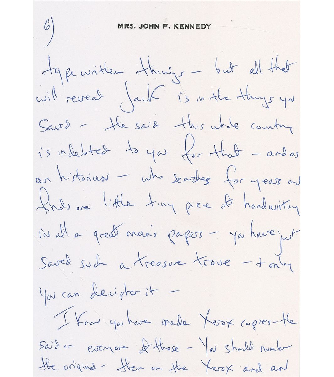 I am sure you have all that—but if you haven’t—just forget about everything else—because Uncle Lefty says never before in history has there been such a gold mine of what will reveal the true man—as there is in all the things you have saved—Scholars and archivists can go over all the type written things—but all that will reveal Jack is in the things you saved—He said this whole country is indebted to you for that—and as an historian—who searches for years and finds one little tiny piece of handwritten in all a great man’s papers—you have just saved such a treasure trove—& only you can decipher it…Apparently there has never been anything like it in history—so for heaven’s sake—lock up the original in a fire proof place—and really work on the others, the Xerox copies—nothing has more importance. He cares—as an historian—and as someone who worshipped the President—I told him you were doing all this—but he so wanted to be reassured—because someone like him—who has had to track down people in history though little minor tidbits—a bill here—a cancelled check there—a faded letter 2 centuries old—he knows what you have—and he just can’t sleep until he knows that all that is annotated as it should be…He loved the President—and he wants to make sure—as you & I do—that future people will know all his different sides—and how much he himself did—so that we just won’t get the Sorensen State paper view of his administration—so it would be lovely if you could reassure him.” In fine condition. Provenance: The Robert L. White Collection; Guernsey’s, 2005.