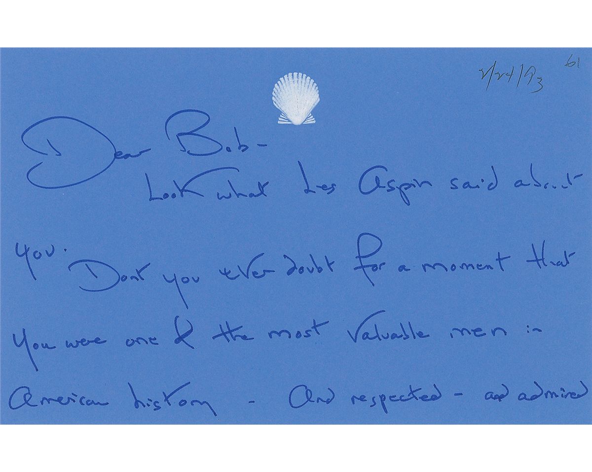 ALS signed “Jackie,” one page both sides, 6.25 x 4, sea shell letterhead, no date. Letter to Secretary of Defense Robert McNamara, dated “2/24/93,” at the top of the first page in McNamara’s hand. In full: “Look what Les Aspin said about you. Don’t ever doubt for a moment that you were one of the most valuable men in American history—And respected—and admired and loved. That’s why people want to write books about you—because you towered above the others—I’m sure you’d be willing to give up that dubious compliment! But it is a compliment and you let them diminish you by getting upset. Didn’t Mrs. Roosevelt say ‘No one can humiliate me without my assent?’ You will always be a shining knight to me.” In fine condition. A hearfelt letter probably sent in response to an earlier downcast note from McNamara. Provenance: The Robert S. McNamara Collection, Sotheby’s 2012.