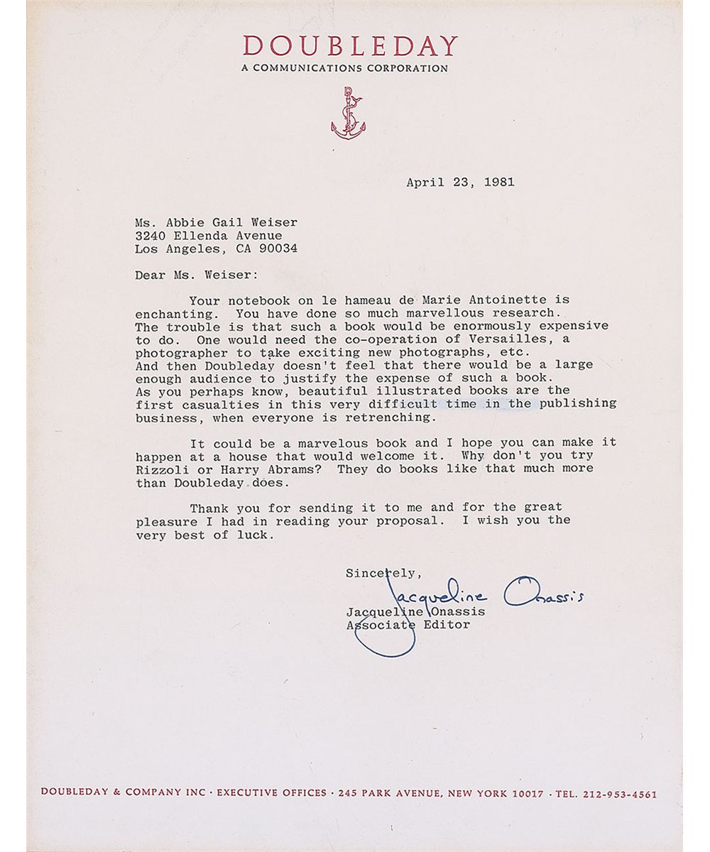 TLS signed “Jacqueline Onassis,” one page, 8.5 x 11, Doubleday letterhead, April 23, 1981. Letter to Abbie Gail Weiser, written as associate editor, in part: “Your notebook on le hameau de Marie Antoinette is enchanting. You have done so much marvellous research. The trouble is that such a book would be enormously expensive to do. One would need the co-operation of Versailles, a photographer to take exciting new photographs, etc. And the Doubleday doesn’t feel that there would be a large enough audience to justify the expense of such a book…beautiful illustrated books are the first casualties in this very difficult time in the publishing business…It could be a marvelous book and I hope you can make it happen…Why don’t you try Rizzoli or Harry Abrams? They do books like that much more than Doubleday does.” In fine condition. Le Hameau de Marie Antoinette is a rustic village built as a place of leisure for the queen, complete with thatched cottages, a mill, dairies, and a farm surrounding a lake; it seems that Weisner’s pitch did not succeed with any publishers, with no record of such a book ever being released.