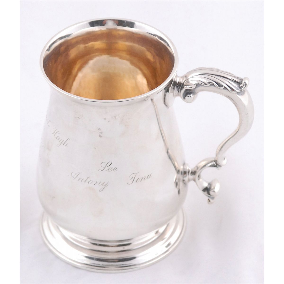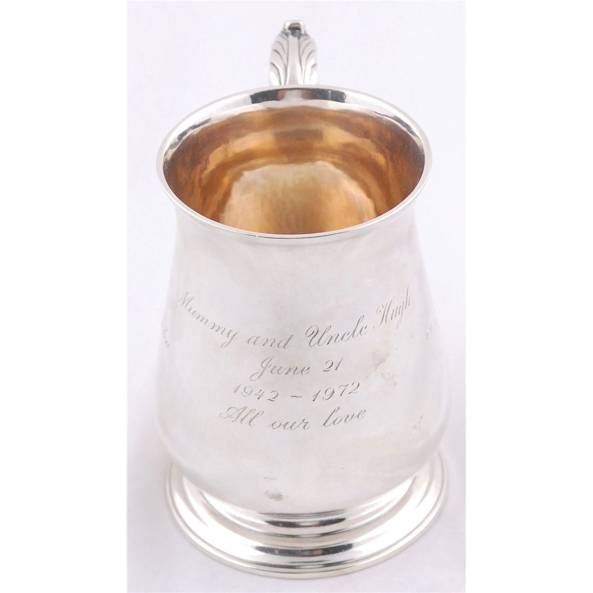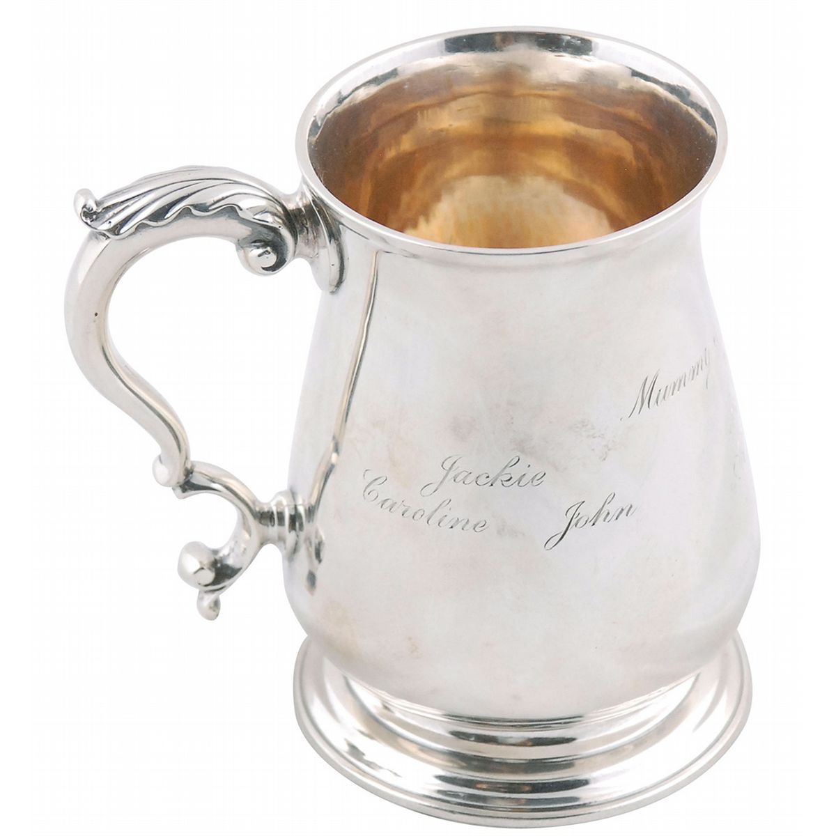 Gorgeous sterling silver cup or pitcher hallmarked sterling in London, 1771, by Charles Wright, measuring 4.25? tall with a 3? diameter at the base, engraved later as a gift for her mother Janet Lee Auchincloss, “Mummy and Uncle Hugh, June 21, 1942–1972, All Our Love, Jackie, Caroline, John, Lee, Antony, Tina.” In fine condition. Provenance: Hammersmith Farm, the Victorian mansion of Janet Lee Auchincloss and the childhood home of Jacqueline Bouvier, Newport, Rhode Island.