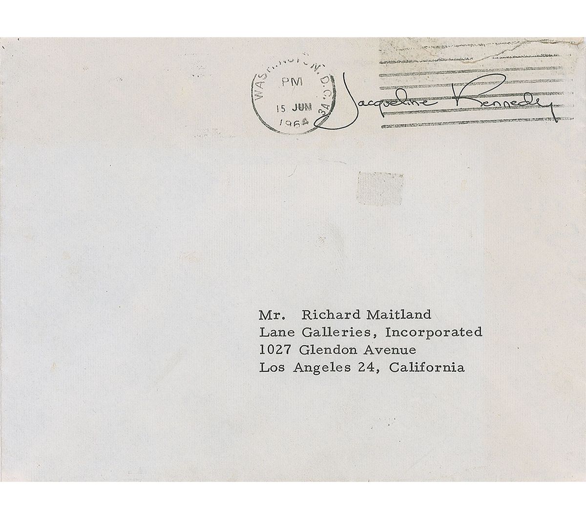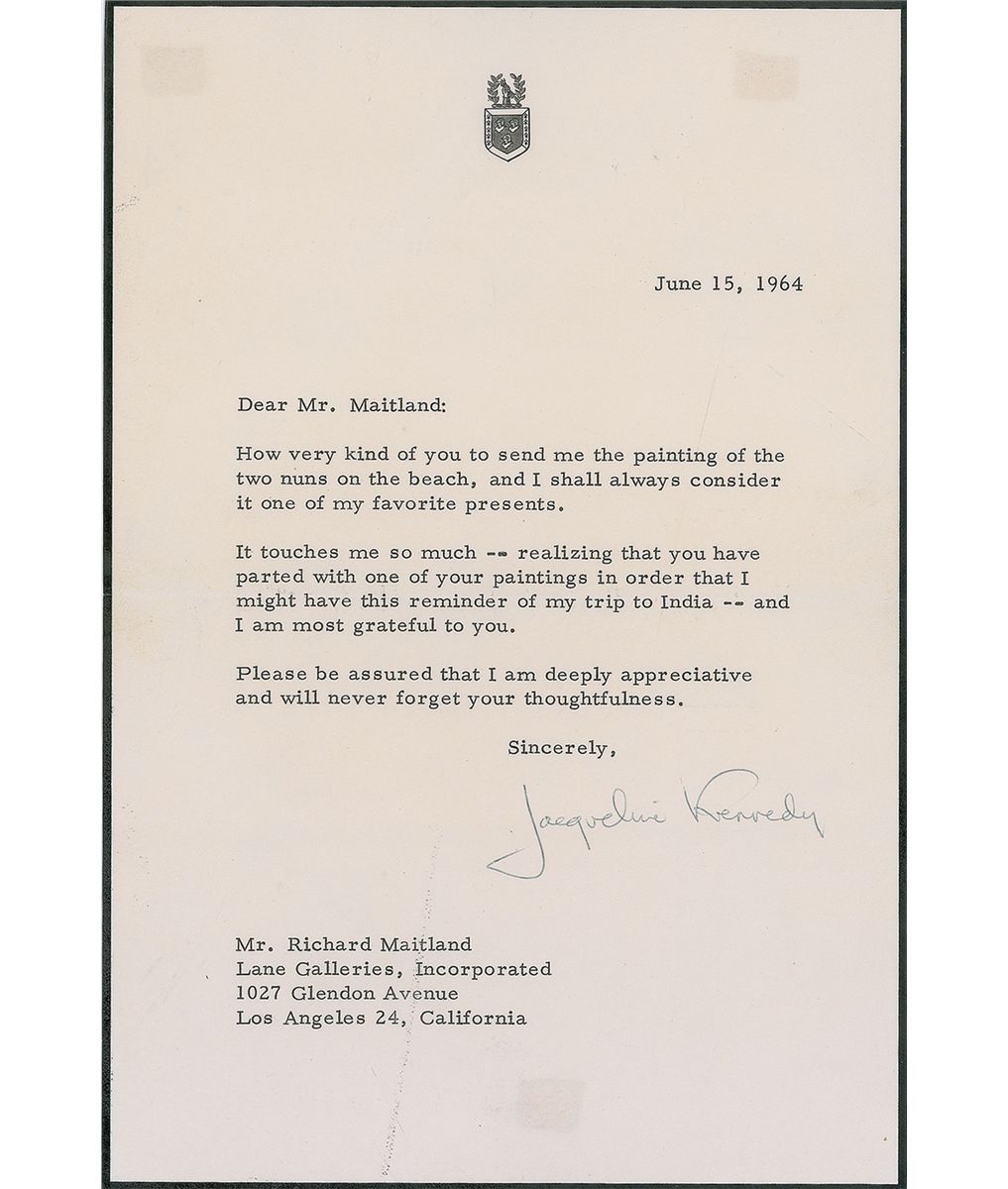 TLS, one page, 6.25 x 9.25, black-bordered stationery, June 15, 1964. Letter of thanks to Richard Maitland of Lane Galleries. In part: “How very kind of you to send me the painting of the two nuns on the beach, and I shall always consider it one of my favorite presents. It touches me so much—realizing that you have parted with one of your paintings in order that I might have this reminder of my trip to India—and I am most grateful to you.” Accompanied by the original mailing envelope, which bears a pre-printed franking signature. In fine condition, with a couple blocks of light toning from tape on reverse.