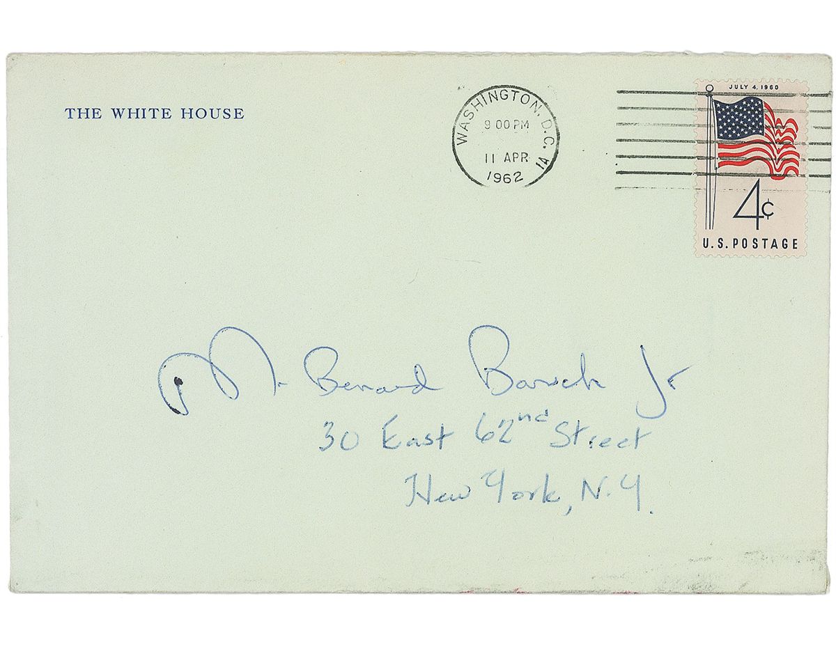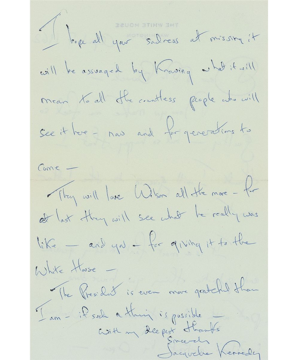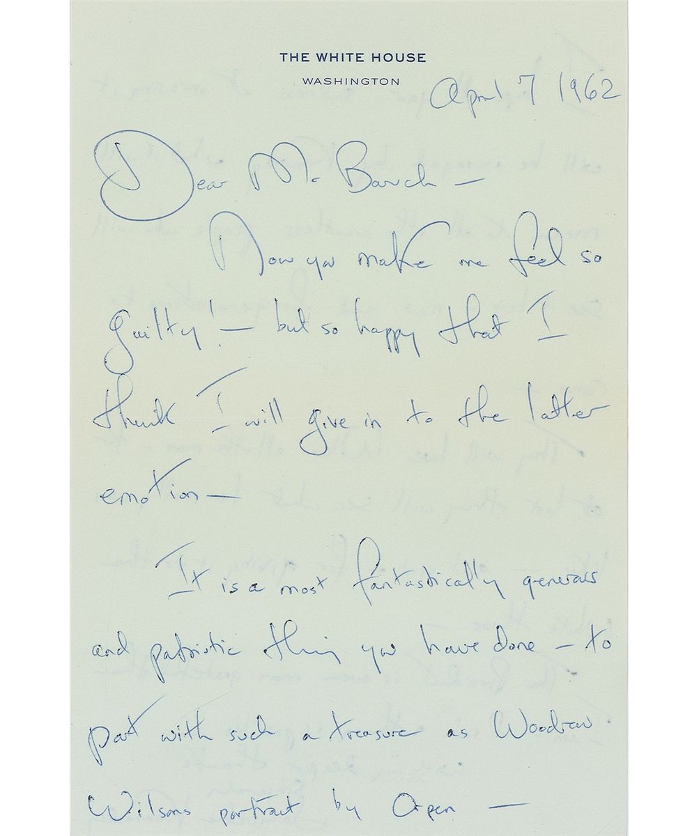 ALS as first lady, one page both sides, 6 x 9.25, White House letterhead, April 7, 1962. Letter to notable financier Bernard Baruch. In full: “Now you make me feel so guilty!—but so happy that I think I will give in to the latter emotion—It is a most fantastically generous and patriotic thing you have done—to part with such a treasure as Woodrow Wilson's portrait by [Sir William] Orpen—I hope all your sadness at missing it will be assuaged by knowing what it will mean to all the countless people who will see it here—now and for generations to come—They will love Wilson all the more—for at last they will see what he really was like—and you—for giving it to the White House—The President is even more grateful than I am—if such a thing is possible.” In fine condition. Accompanied by the original mailing envelope, addressed in Kennedy’s hand. As first lady, Jacquline Kennedy’s first major project was the restoration of the White House and promotion of its importance; she sent countless personal requests to those who owned pieces of historical interest that might be donated. In 1962, she published a guide book to the Executive Mansion in hopes of spreading knowledge of its history within the general citizenry.