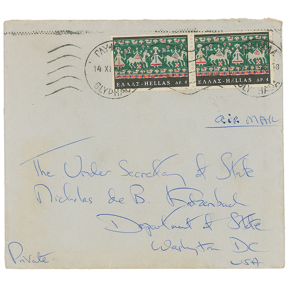 Hand-addressed mailing envelope, 4.75 x 4.25, addressed by Kennedy to Nicholas Katzenbach, “The Under Secretary of State, Nicholas de B. Katzenbach, Department of State, Washington DC, USA,” adding “Air Mail” in the upper right and “Private” in the lower left. She adds her return address on the flap, incorporating her last name, “Onassis—Island of Skorpios—Greece.” The envelope bears two affixed Greek postage stamps, postmarked Glyphada, Greece, November 21, 1968. Various marks and soiling affecting her handwritten return address, otherwise fine condition. Accompanied by a color photocopy of the letter originally enclosed. Katzenbach had been deputy attorney general during John F. Kennedy’s presidency before serving as attorney general, and then undersecretary of state, under LBJ. Jackie had married Aristotle Onassis less than a month earlier on Skorpios, their private island.