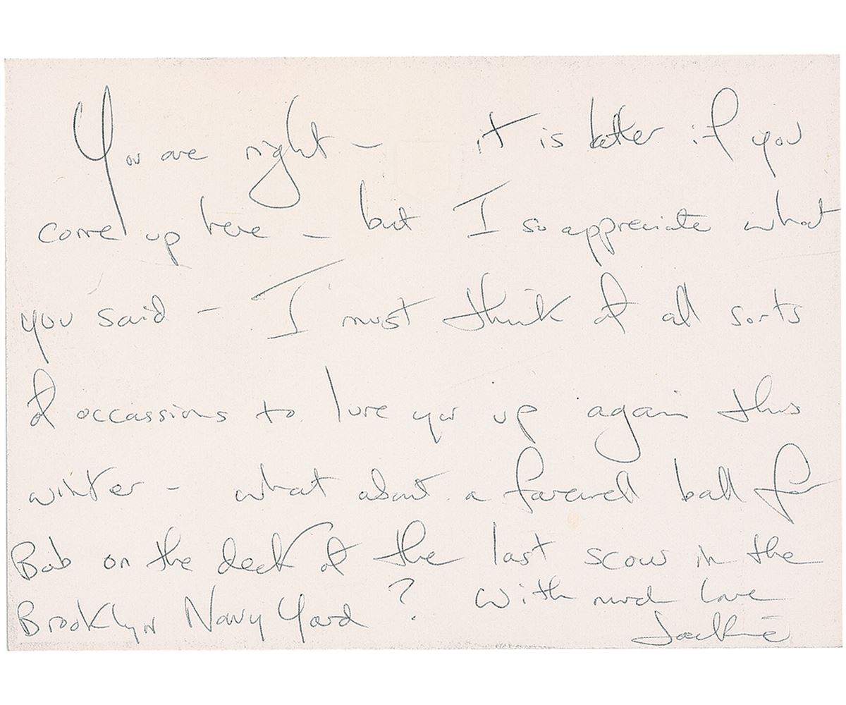 ALS signed “Jackie,” one page both sides, 5 x 3.5, black-bordered personal letterhead, October 8, 1965. Letter to the wife of John F. Kennedy’s Secretary of Defense Robert McNamara, in full: “Thank you for the beautiful flowers you sent after the party and for your sweet and kind letter. You are right, it is better if you come up here but I so appreciate what you said. I must think of all sorts of occasions to lure you up again this winter—what about a farewell ball for Bob on the deck of the last scow in the Brooklyn Navy Yard?” In fine condition, with the pencil date added in Robert McNamara’s hand. Letter originates from the estate of Robert S. McNamara.