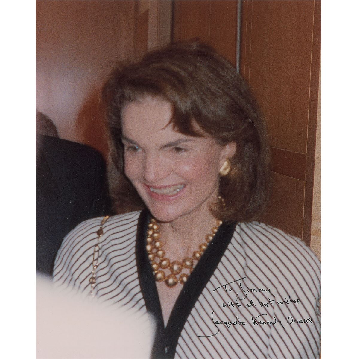 Beautiful color glossy 8 x 10 photo of Jackie smiling, signed and inscribed in black felt tip, “To Jimmy, with all best wishes, Jacqueline Kennedy Onassis.” In fine condition.