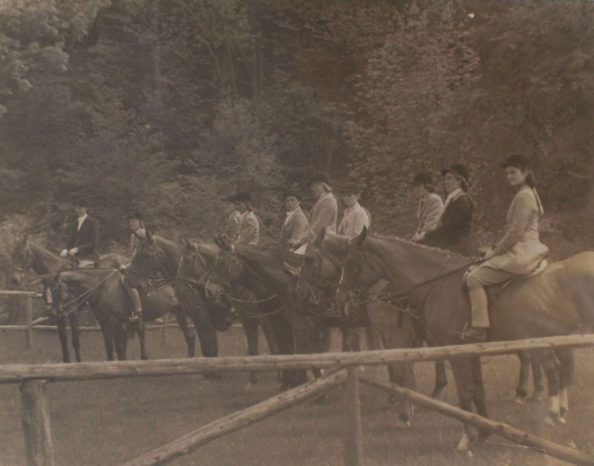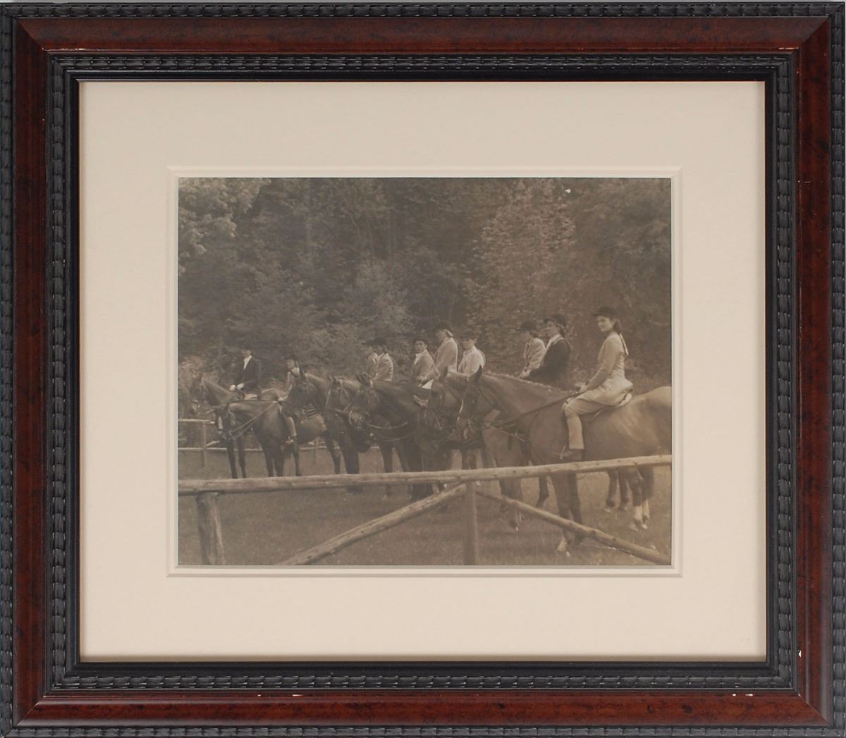 Wonderful unsigned matte-finish 9 x 7 photo of Jacqueline Bouvier in an equestrian class at Miss Porter’s School in Farmington, Connecticut, during the 1940s. Archivally double-matted and framed to an overall size of 16 x 14. In fine condition.