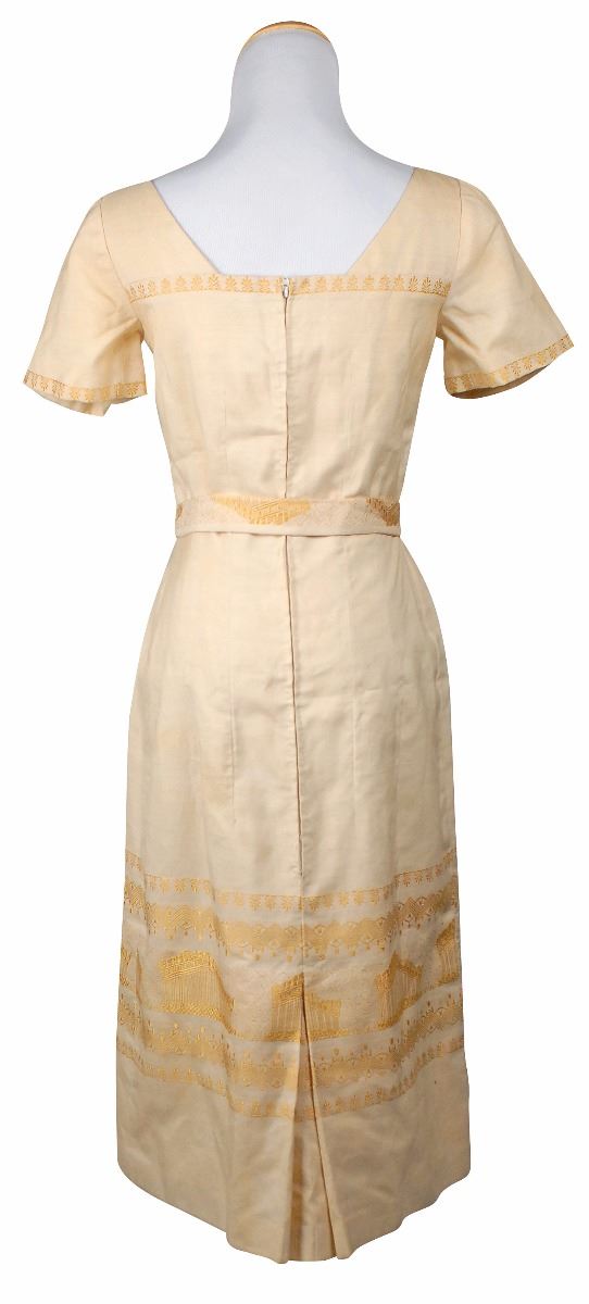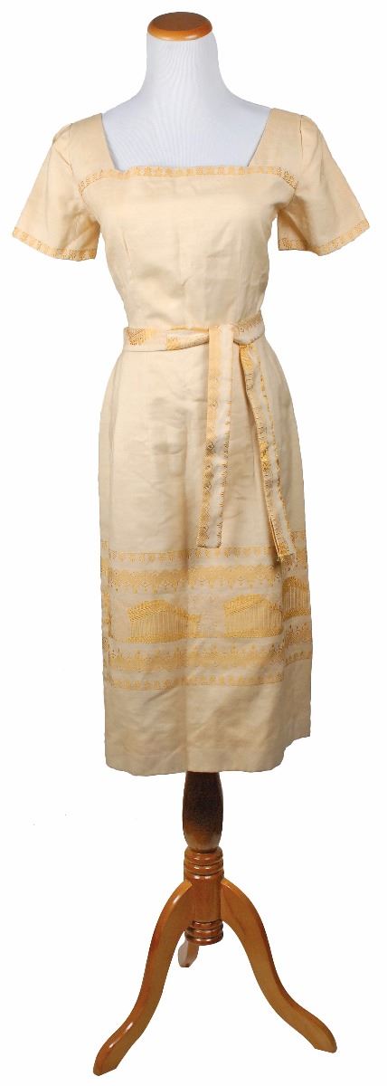 Dress made for Kennedy’s personal secretary Mary Gallagher from linen brought back from Greece by Jacqueline Kennedy. Short-sleeve cream-colored dress has an embroidered design of the Acropolis near the bottom, a zip-up back, and a sash belt made from the same material. Dress was made for Gallagher by White House seamstress Lucinda Mormon. Accompanied by a photocopy of a 2001 letter of provenance from Gallagher which reads, in part, “This linen, cream-colored, dress with a design of the Greek Acropolis…was hand-made for me by Lucinda Morman, White House Seamstress. The material for this dress was given to me by Mrs. Kennedy upon her return from Greece in 1963…Mrs. Kennedy regularly brought back yard goods from her travels, storing them in the third floor closet for her future needs and/or for gifts to employees…Since receiving this, it has remained in my possession at my home.” In fine condition. Provenance: The Robert L. White Collection; Guernsey’s, 2005.
