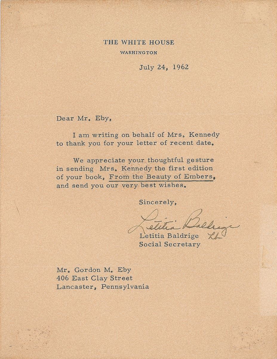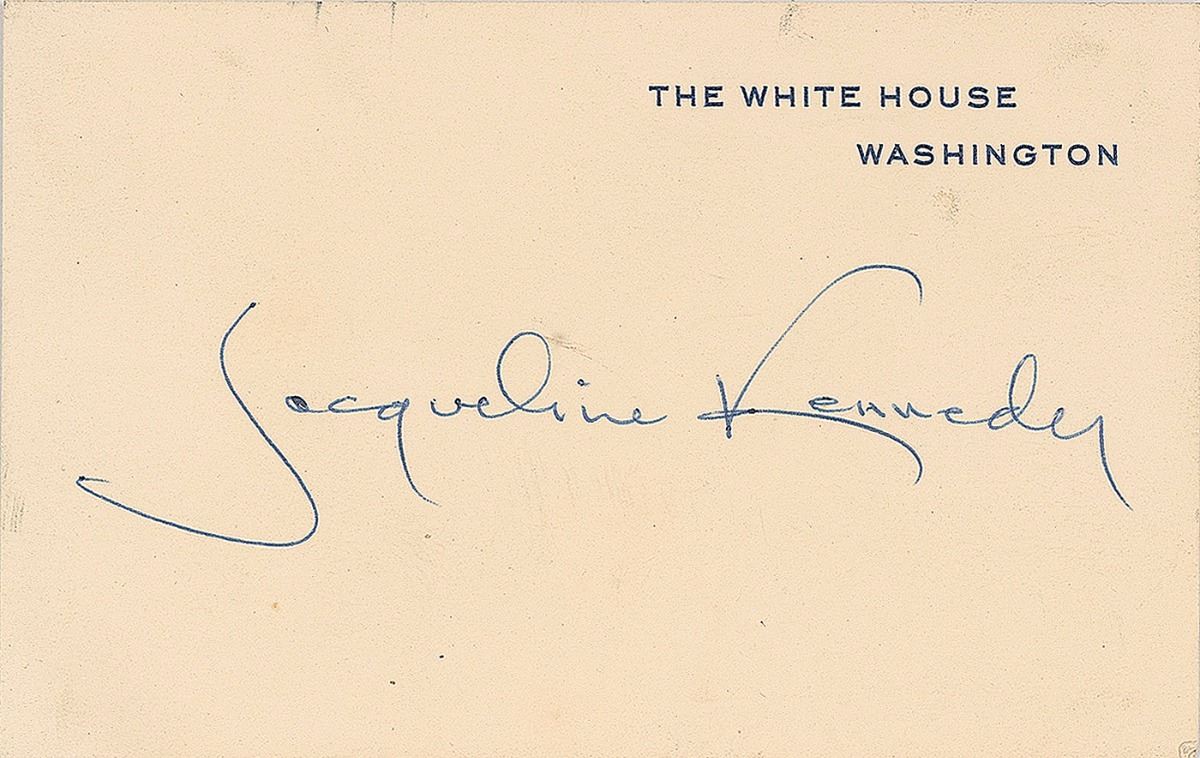 White House card signed as first lady in blue ballpoint, “Jacqueline Kennedy.” In fine condition, with surface loss on reverse from removed tape. Accompanied by a letter of transmittal from a White House secretary, dated July 24, 1962. A scarce and sought-after format.