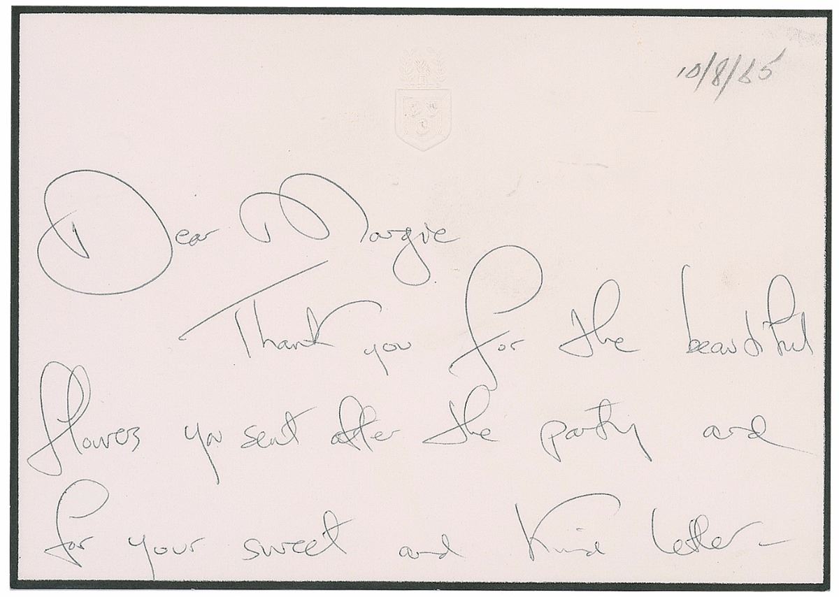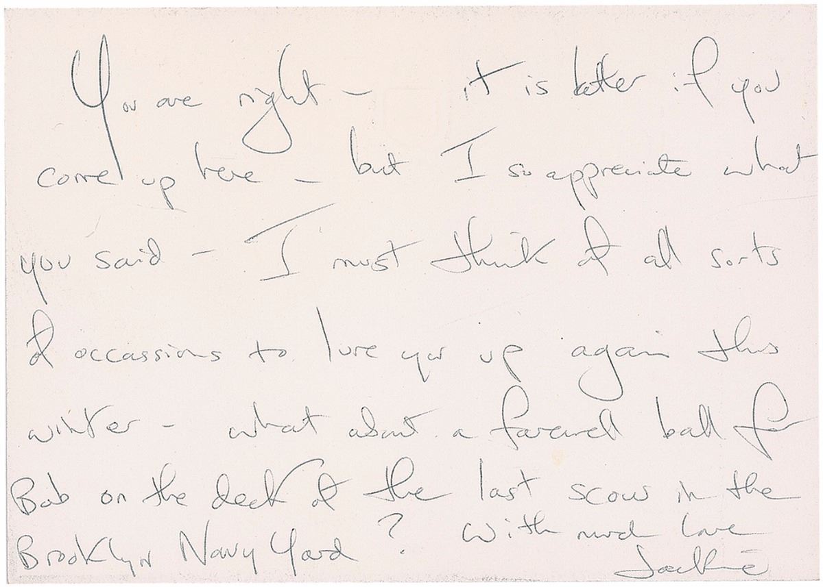 ALS signed “Jackie,” one page both sides, 5 x 3.5, black-bordered personal letterhead, October 8, 1965. Letter to the wife of John F. Kennedy’s Secretary of Defense Robert McNamara, in full: “Thank you for the beautiful flowers you sent after the party and for your sweet and kind letter. You are right, it is better if you come up here but I so appreciate what you said. I must think of all sorts of occasions to lure you up again this winter—what about a farewell ball for Bob on the deck of the last scow in the Brooklyn Navy Yard?” In fine condition, with the pencil date added in Robert McNamara’s hand. Letter originates from the estate of Robert S. McNamara.