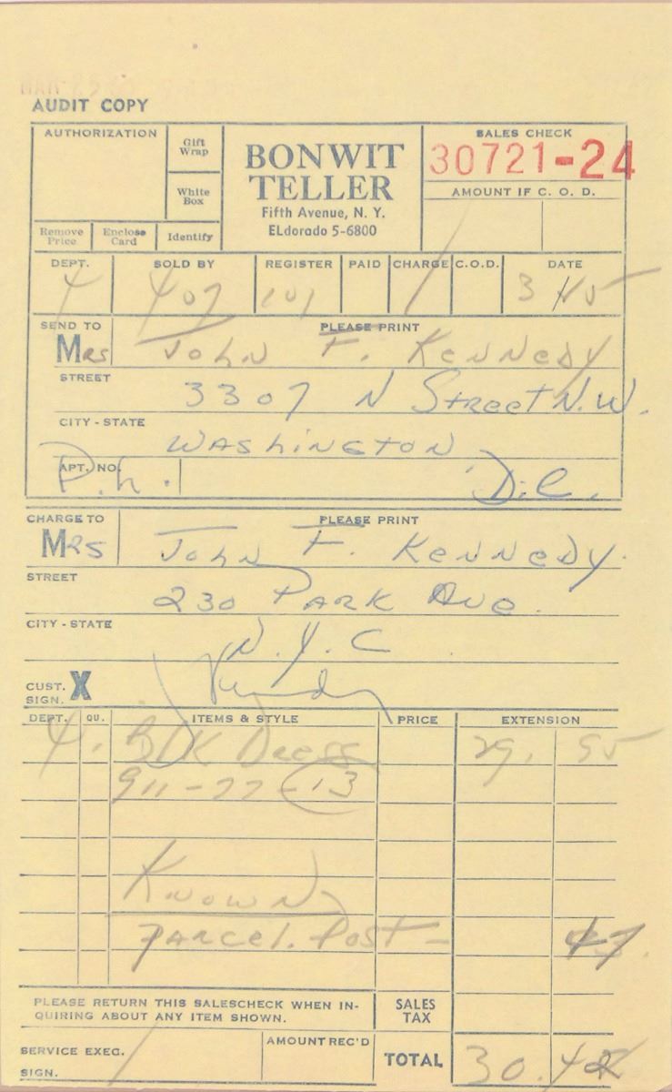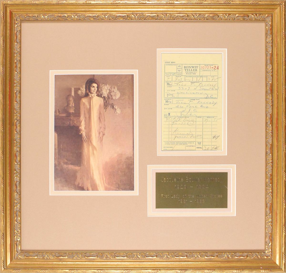 Bonwit Teller store receipt, signed “J. Kennedy,” one page, 4.25 x 6.5, March 25, 1960. A receipt for the purchase of a dress totaling $30.42, filled out in a clerk’s hand with her shipping address, “Mrs John F. Kennedy / 3307 N Street N. W. / Washington / D.C.,” and her billing address, “Mrs. John F. Kennedy / 230 Park Ave. / N.Y.C.,” noting the specific item purchase at the bottom, “Blk Dress.” Quickly signed at the conclusion in blue ballpoint by Kennedy. Attractively double-matted and framed with an engraved plaque and portrait to an overall size of 19.5 x 18.75. In fine condition.