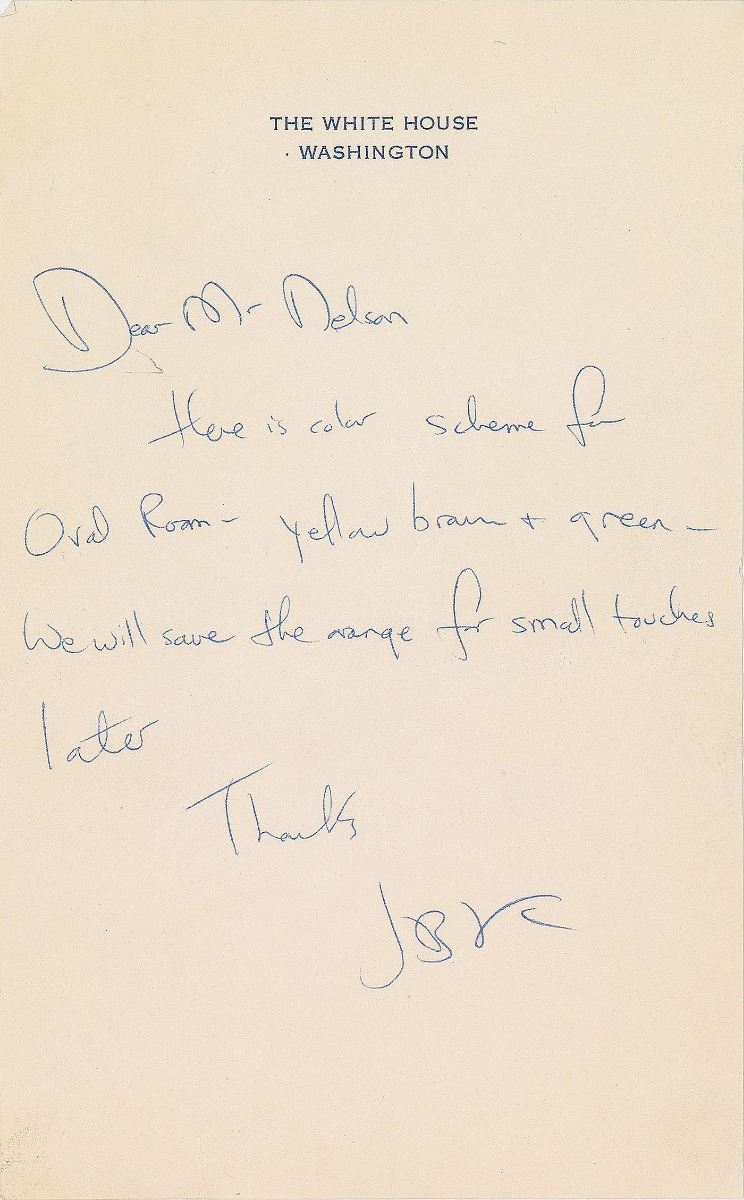 ALS signed “JBK,” 5 x 8, White House letterhead, no date but circa 1961–1963. Letter to “Mr. Nelson,” in full: “Here is color scheme for Oval Room—yellow brown & green—We will save the orange for small touches later.” In very good condition, with scattered overall creasing.