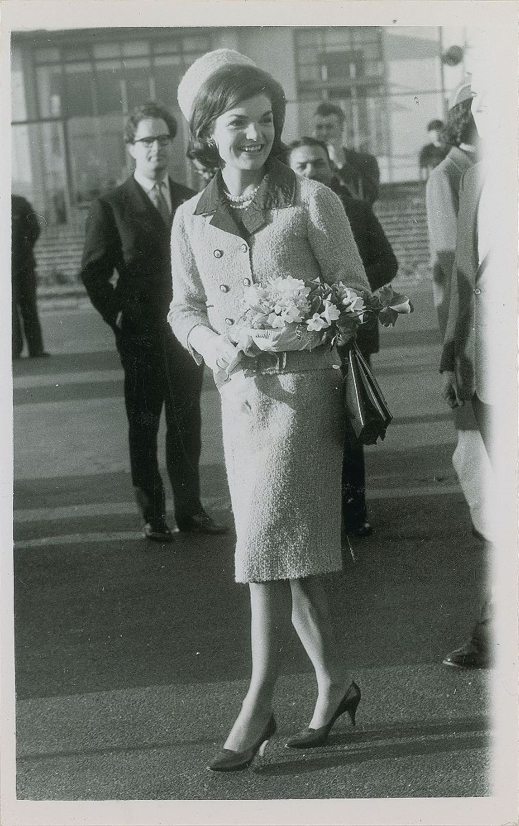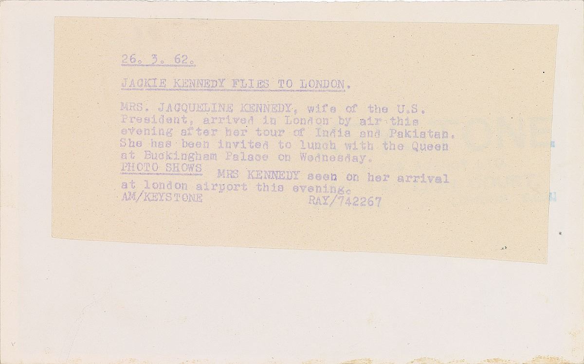 Original vintage glossy 5 x 8 silver gelatin photo of First Lady Jacqueline Kennedy arriving at the airport in London on March 26, 1962, following her tour of India and Pakistan. Reverse bears an affixed caption and Keystone Press Agency credit stamp. In fine condition.