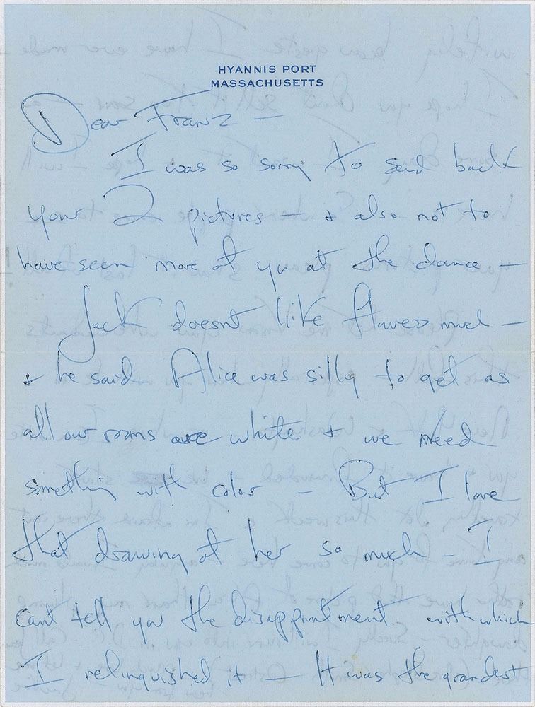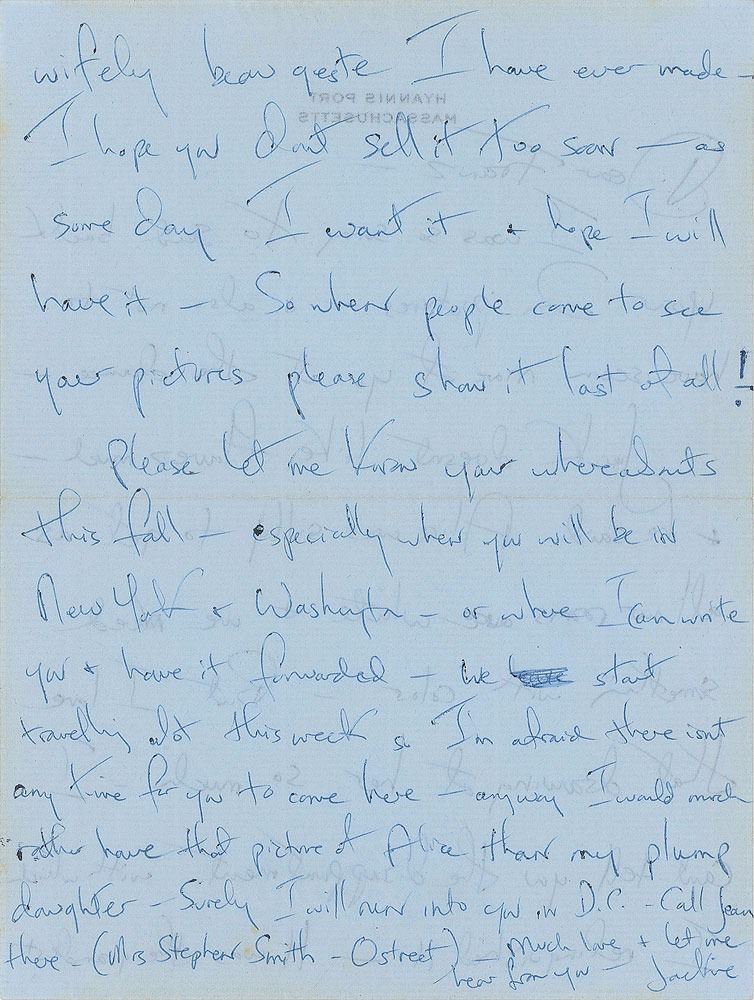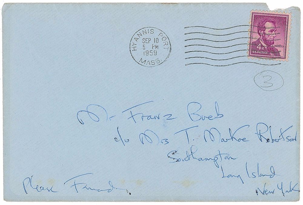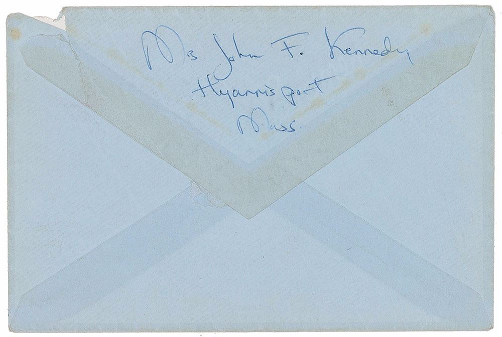 ALS signed “Jackie,” one page both sides, 5.75 x 7.75, Hyannis Port letterhead, no date but postmarked September 10, 1959. Letter to artist Franz Bueb, in part: "I was so sorry to send back your 2 pictures—& also not to have seen more of you at the dance—Jack doesn't like flowers much—& he said Alice was silly to get as all our rooms are white & we need something with color—But I love that drawing of her so much—I can't tell you the disappointment with which I relinquished it—It was the grandest wifely beau geste I have ever made—I hope you don't sell it too soon—as some day I want it & hope I will have it—So when people come to see your pictures please show it last of all! Please let me know your whereabouts this fall—especially when you will be in New York & Washington…Surely I will run into you in D.C.—Call Jean there (Mrs. Stephen Smith, O Street)." In fine condition. Accompanied by the original mailing envelope addressed by Kennedy, including her return address, "Mrs. John F. Kennedy, Hyannisport, Mass," on the flap. Bueb was a German-born artist who taught painting to Jacqueline Kennedy during the 1950s and 1960s. Bueb painted many portraits of the future first lady, as well as various landscapes of Chatsworth, England, the former home of John F. Kennedy’s late sister Kathleen.