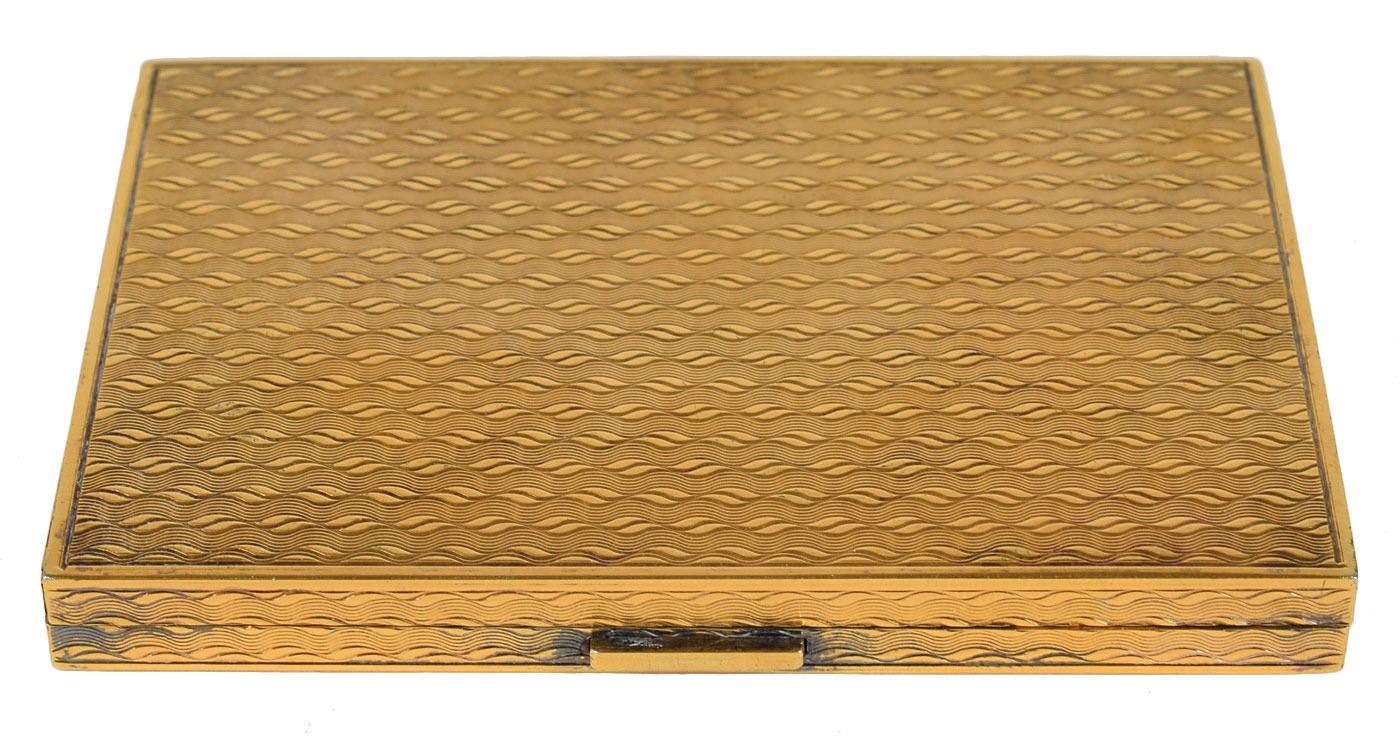 Gold vermeil on sterling silver cigarette case by Tiffany & Co., gifted by Jackie Kennedy to Helen Lempart Westbrook in 1966. The elegant case measures 3.5 x 2.25 x .25, and is engraved inside the spring-loaded cover, "1966, For Helen, with appreciation and affection, JBK." The maker's hallmark is stamped above, "Tiffany & Co., Sterling 925, Italy." In fine condition. Accompanied by a light blue Tiffany cloth bag. The recipient, Helen Lempart Westbrook, worked in the Kennedy White House.