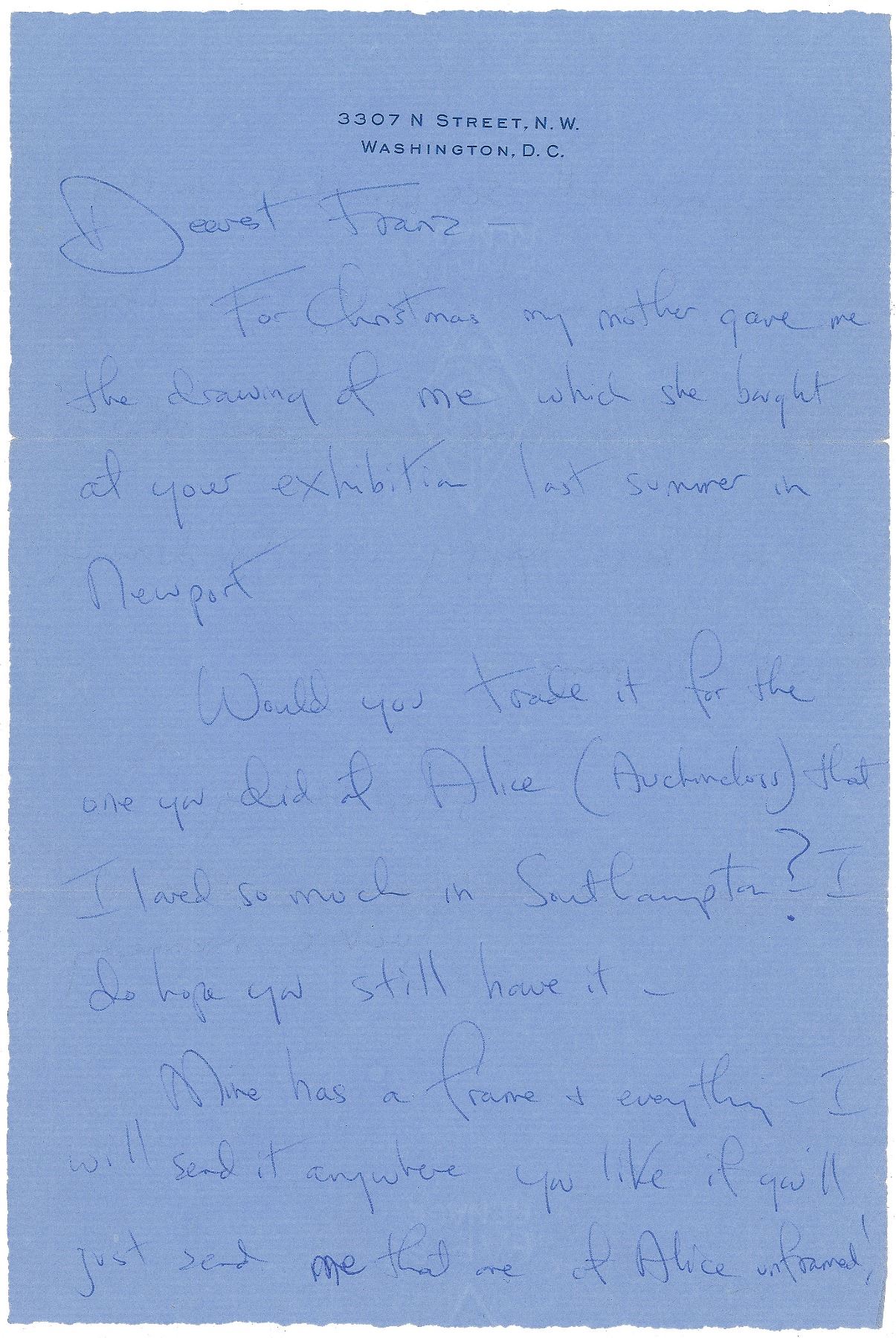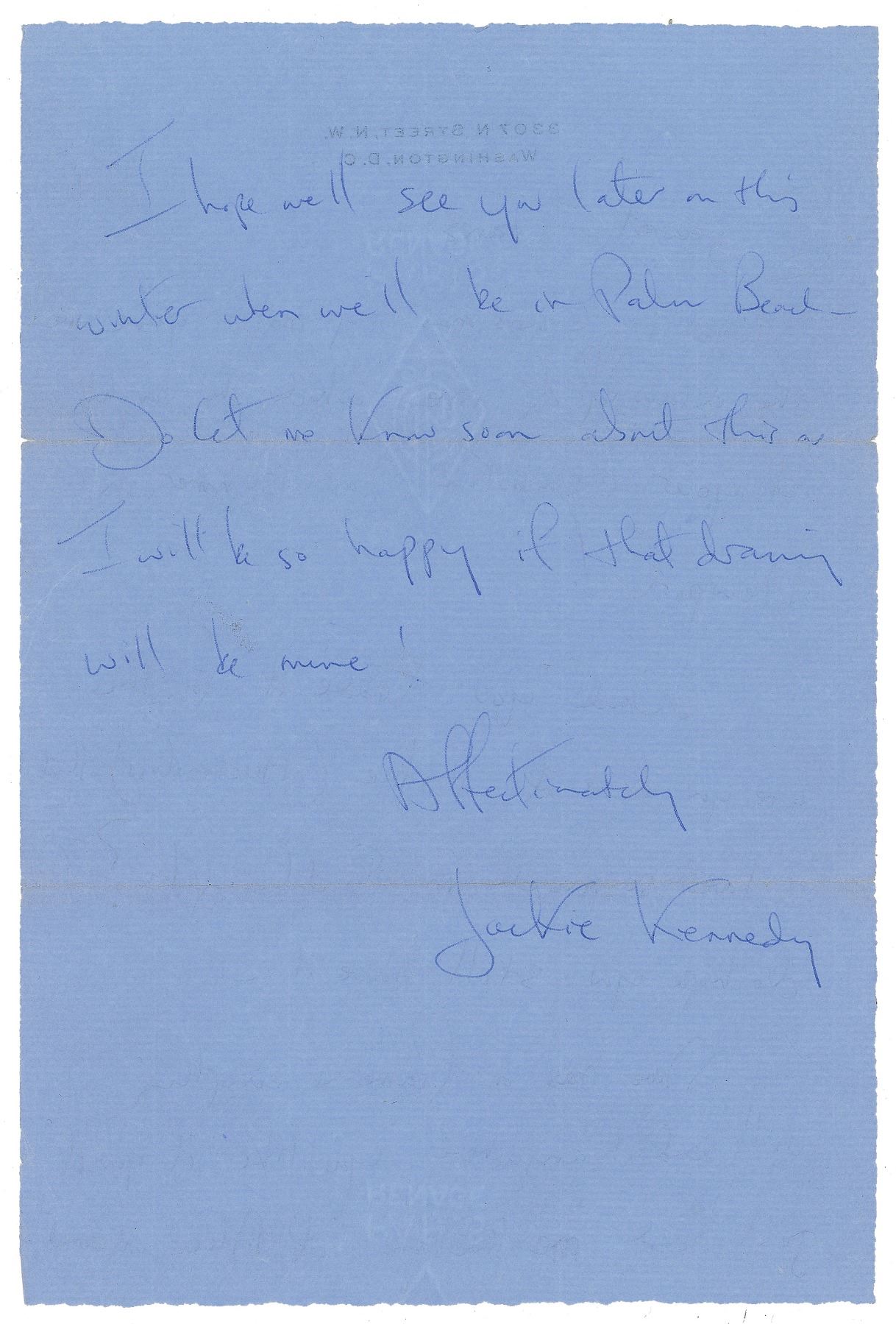 ALS signed “Jackie Kennedy,” one page, 6.25 x 9.25, personal letterhead, no date but circa 1960. Letter to artist Franz Bueb, in part: "For Christmas my mother gave me the drawing of me which she bought at your exhibition last summer in Newport. Would you trade it for the one you did of Alice (Auchincloss) that I loved so much in Southampton? I do hope you still have it. Mine has a frame & everything—I will send it anywhere you like if you will just send me that one of Alice unframed! I hope we'll see you later on this winter when we'll be in Palm Beach. Do let me know soon about this as I will be so happy if that drawing will be mine!" In fine condition. Bueb was a German-born artist who taught painting to Jacqueline Kennedy during the 1950s and 1960s. Bueb painted many portraits of the future first lady, as well as various landscapes of Chatsworth, England, the former home of John F. Kennedy’s late sister Kathleen.