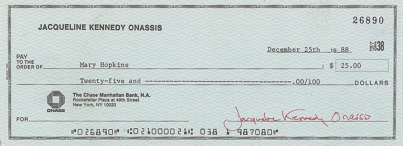 Personal check, 8.25 x 3, filled out in type and signed by Kennedy, "Jacqueline Kennedy Onassis," payable to Mary Hopkins for $25, December 25, 1988. In fine condition, with a central vertical fold, light diagonal crease, and some adhesive residue on the reverse.