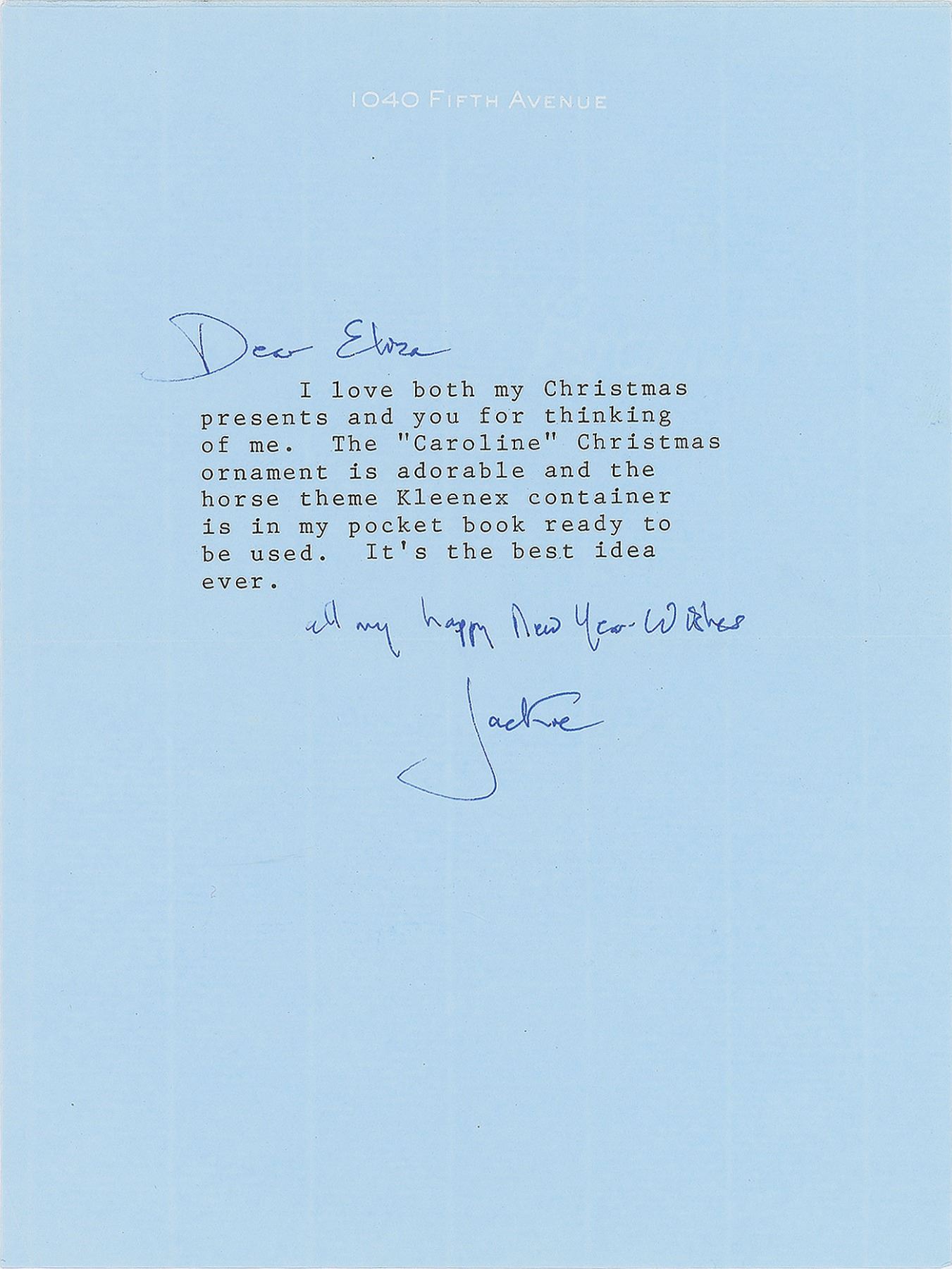 TLS signed “All my happy New Year wishes, Jackie,” one page, 5.75 x 7.75, 1040 Fifth Avenue letterhead, postmarked January 12, 1994. Letter to Elisa Sullivan, in full: "I love both my Christmas presents and you for thinking of me. The 'Caroline' Christmas ornament is adorable and the horse theme Kleenex container is in my pocket book ready to be used. It's the best idea ever." Jackie adds the salutation in her own hand. In fine condition. Accompanied by the original mailing envelope.