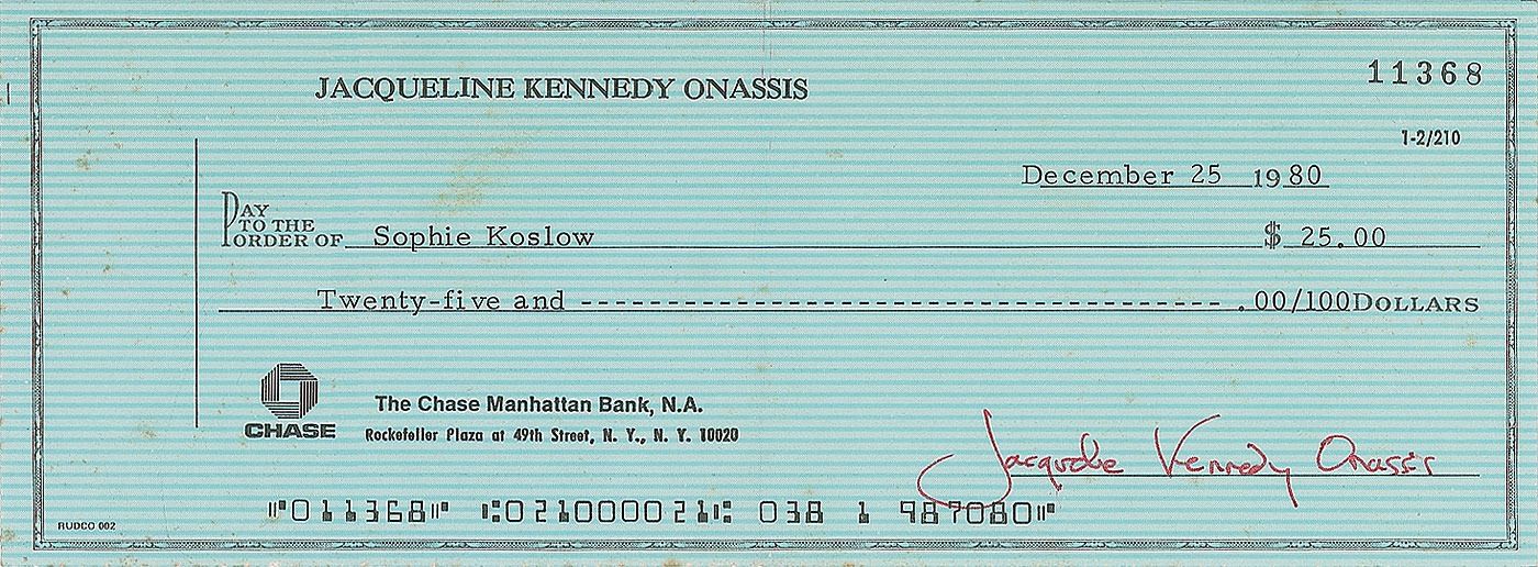 Personal check, 8.25 x 3, filled out in type and signed by Kennedy, "Jacqueline Kennedy Onassis," payable to Sophie Koslow for $25, December 24, 1980. In fine condition, with some light scattered foxing.
