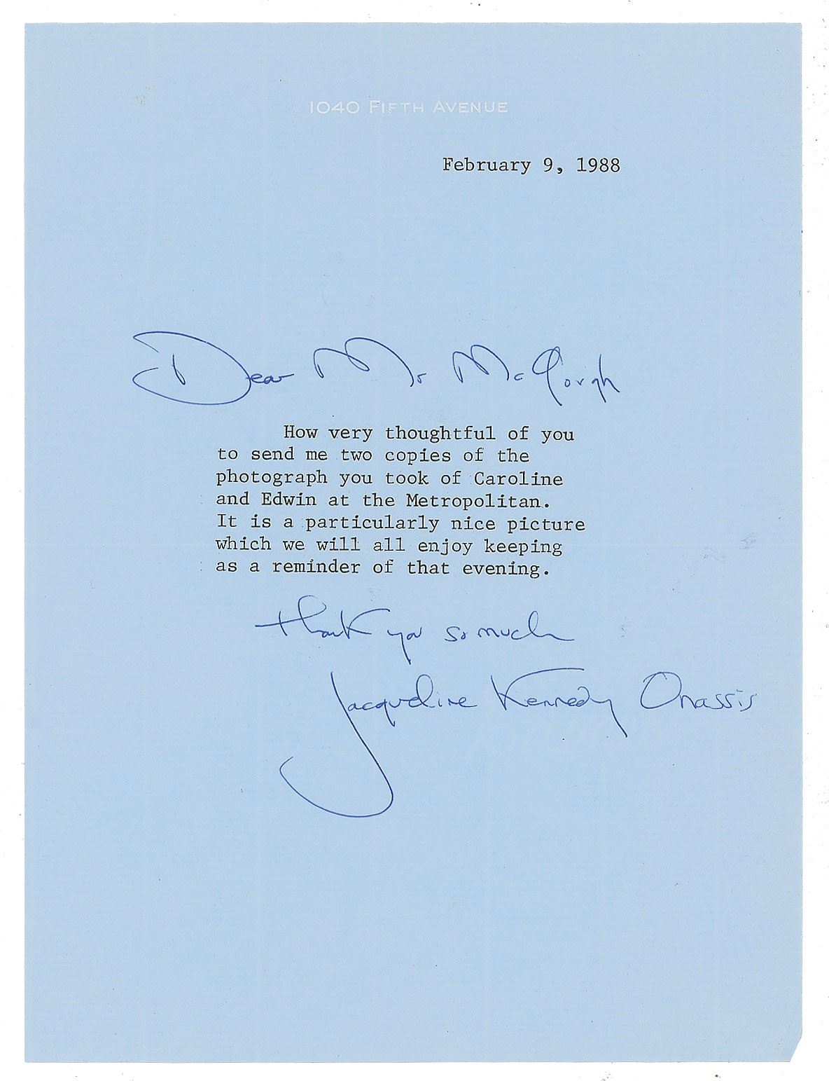 TLS signed “Thank you so much, Jacqueline Kennedy Onassis,” one page, 5.75 x 7.75, personal letterhead, February 9, 1988. Letter to David McGough, in part: "How very thoughtful of you to send me the two copies of the photograph that you took of Caroline and Edwin at the Metropolitan. It is a particularly nice picture which we will all enjoy keeping as a reminder of that evening." In fine condition. Accompanied by the original mailing envelope.
