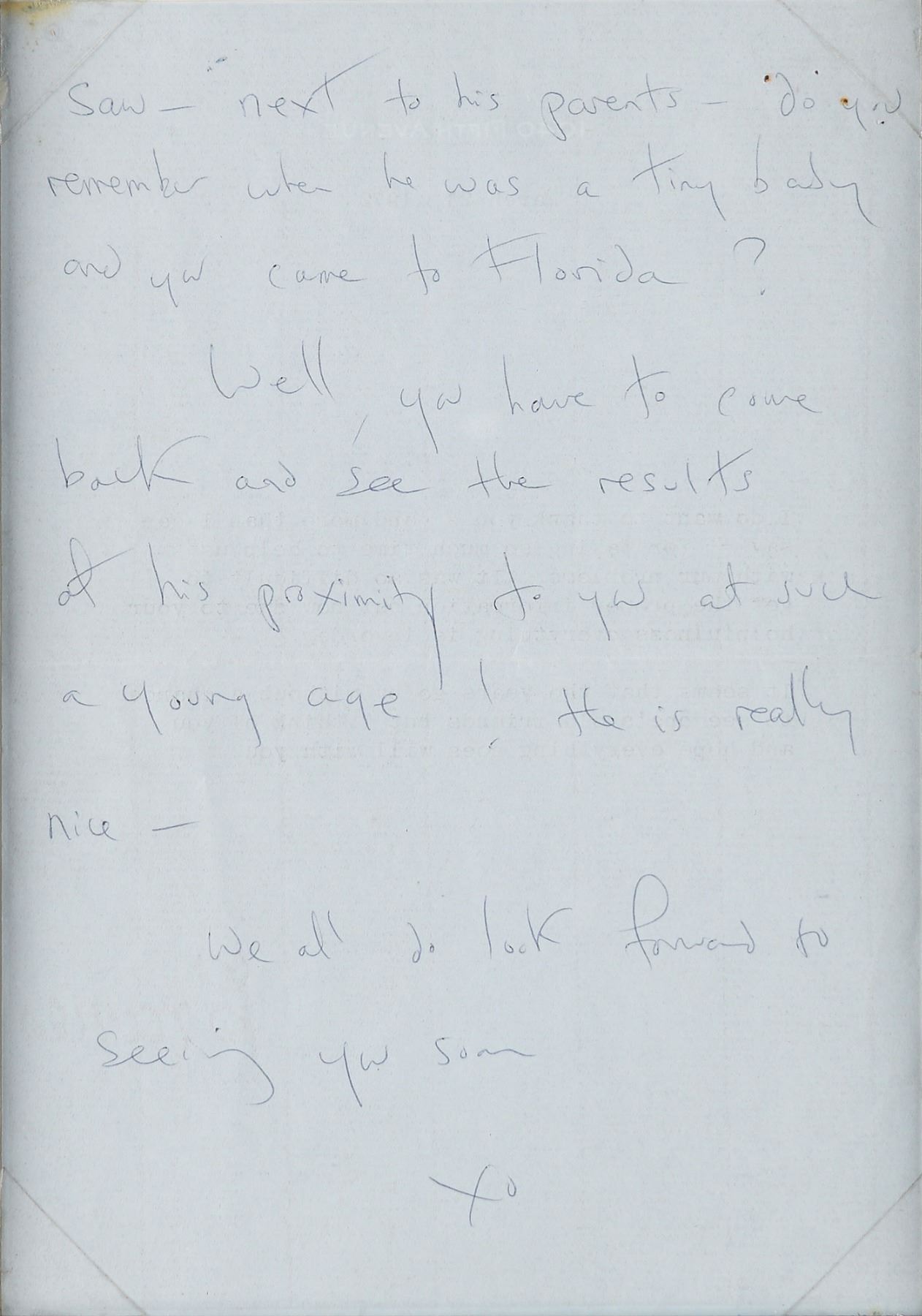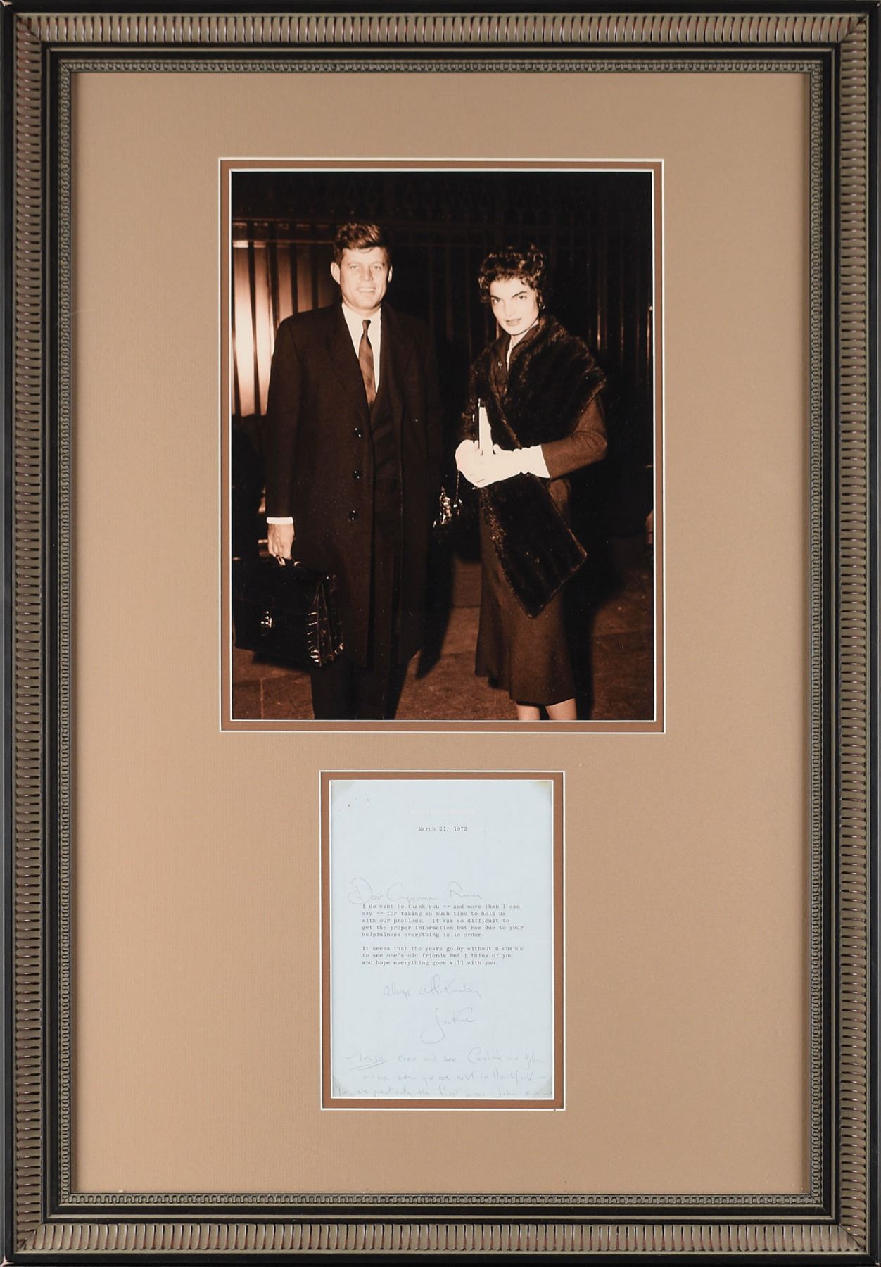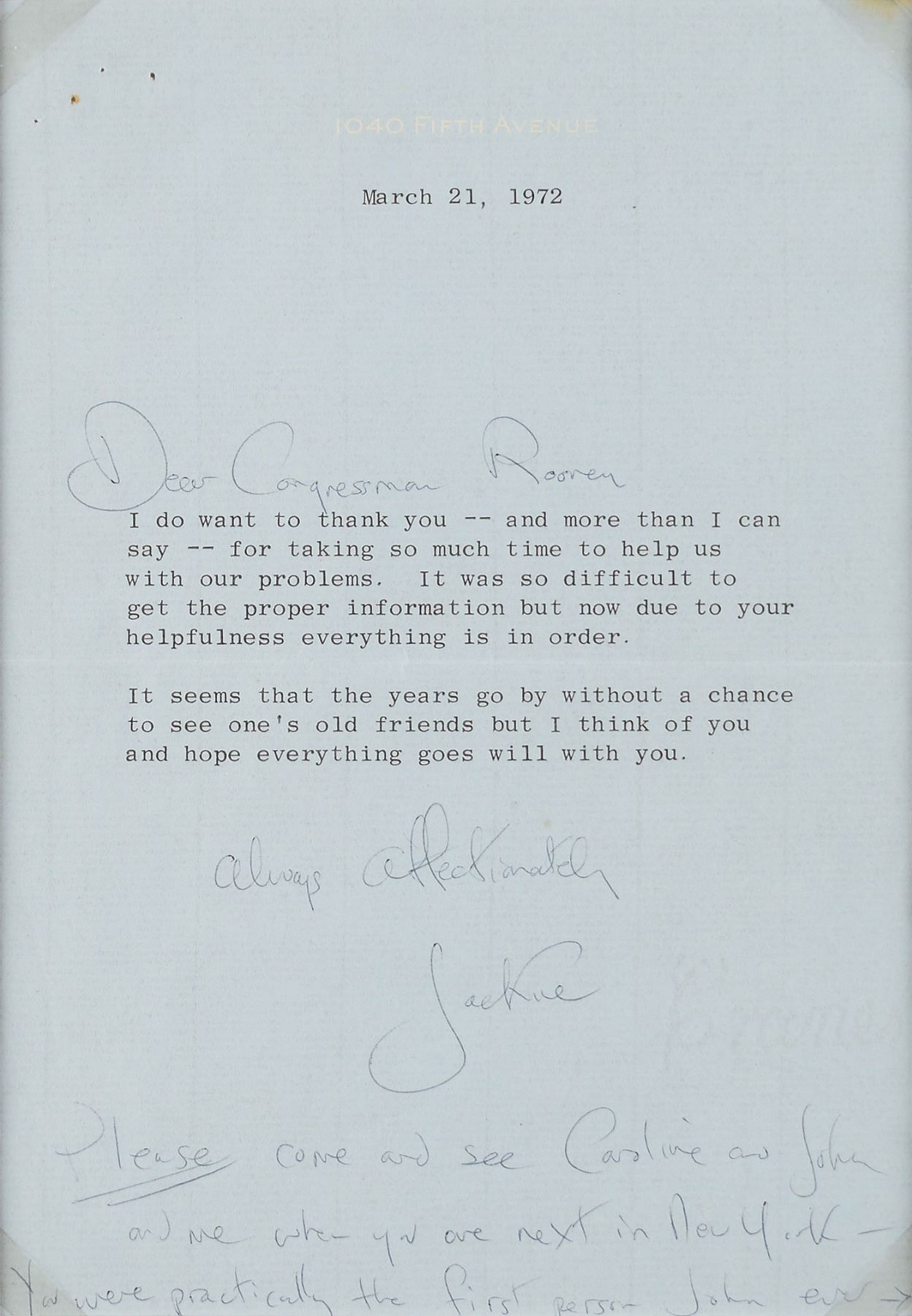 TLS signed “Always affectionately, Jackie,” one page both sides, 5.25 x 7.5, personal letterhead, March 21, 1972. Letter to "Congressman Rooney," in part: "I do want to thank you—and more than I can say—for taking so much time to help us with our problems. It was so difficult to get the proper information but now due to your helpfulness everything is in order. It seems that the years go by without a chance to see one's old friends but I think of you and hope everything goes well with you." She adds a lengthy handwritten postscript: "Please come and see Caroline and John and me when you are next in New York—You were practically the first person John ever saw—next to his parents—do you remember when he was a tiny baby and you came to Florida? Well, you have to come back and see the results of his proximity to you at such a young age! He is really nice—we all do look forward to seeing you. xo." Double-matted and framed with a portrait of JFK and Jackie to an overall size of 20.75 x 29.75, with a window in the backing for viewing the reverse. In fine condition.