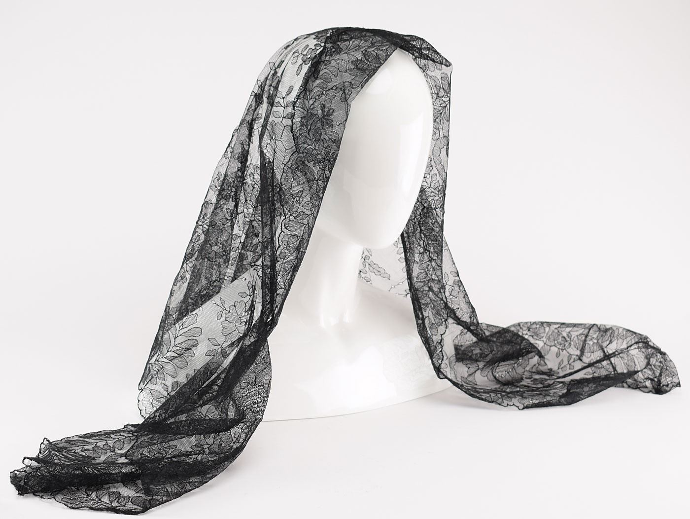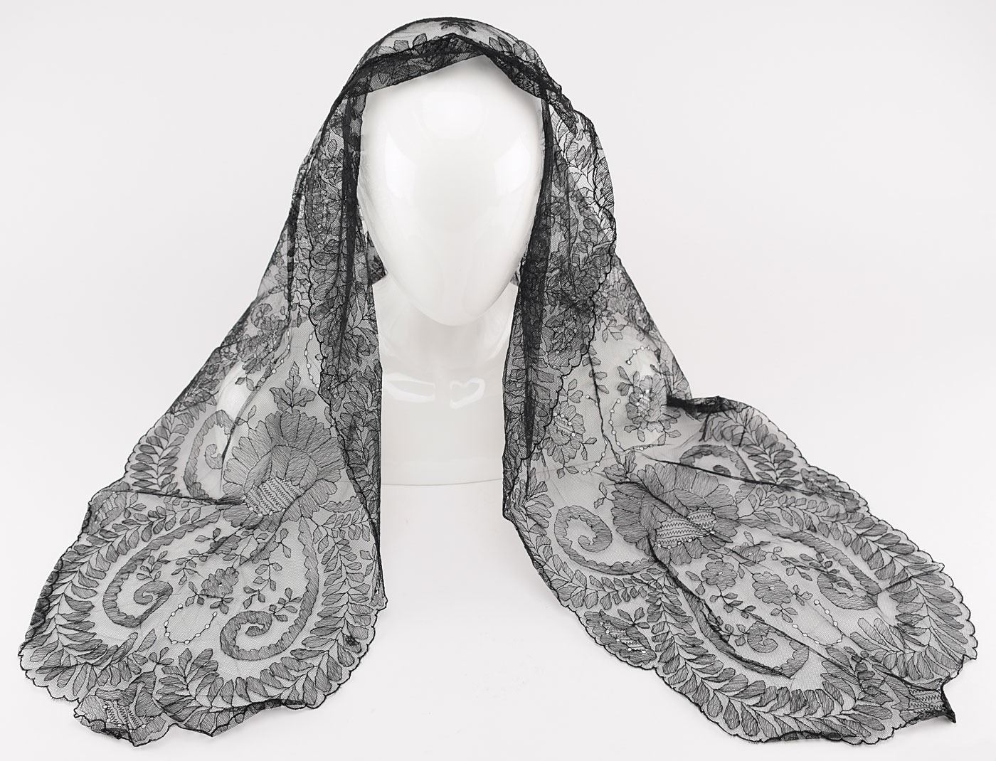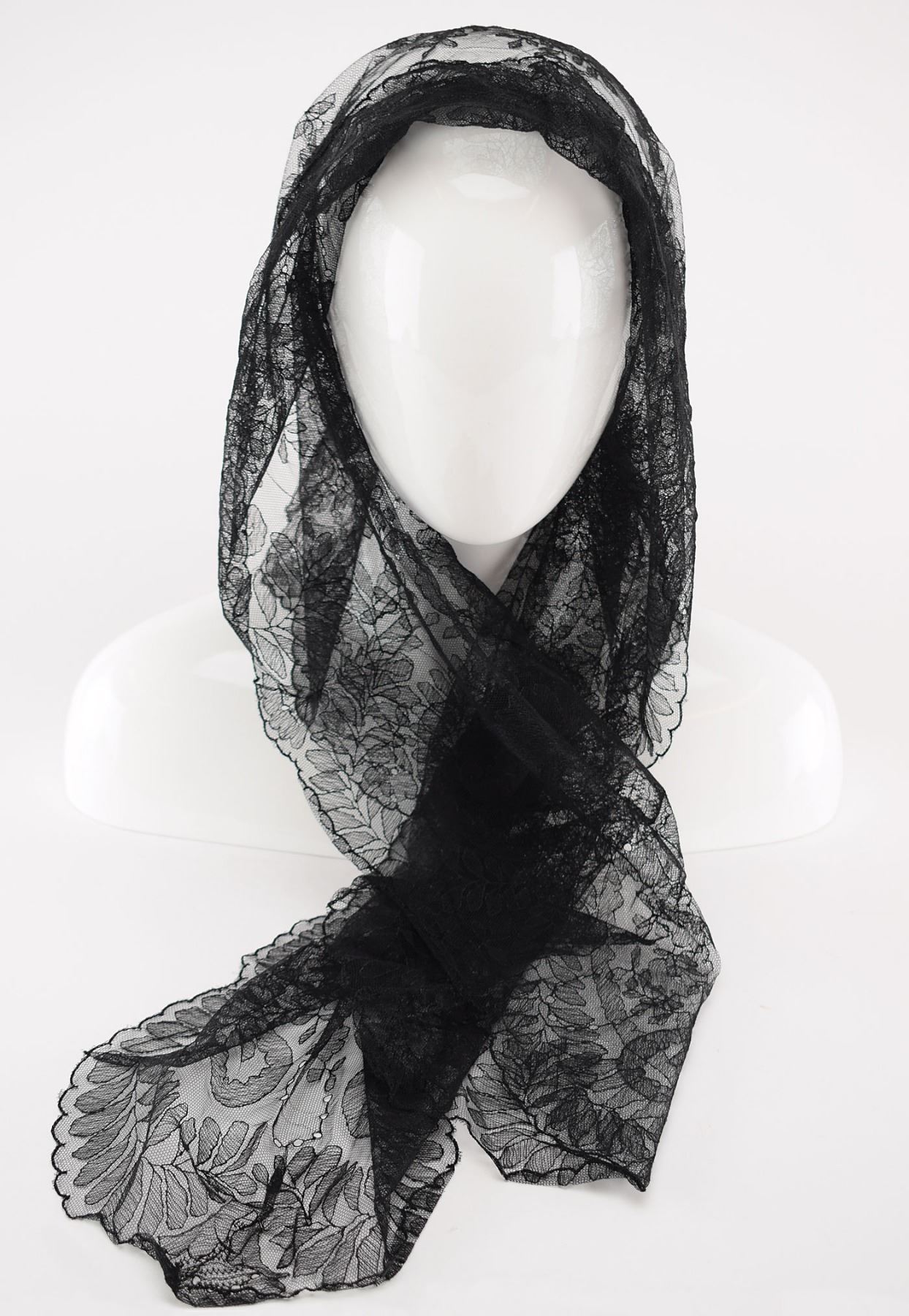 Stunning fine black lace mantilla personally-owned and -worn by Jacqueline Kennedy, measuring approximately 60? x 22?, with gorgeous floral and leaf pattern and scalloped edges. In fine condition. Kennedy was seen wearing a similar black mantilla when she visited the Vatican to meet Pope John XXIII on March 11, 1962; although it is unable to be confirmed, this mantilla may very well be the same one. Jacqueline was also often photographed wearing a mantilla before or after attending a Catholic Church service. Originates from the collection of Mary Gallagher, who served as personal secretary to Mrs. Kennedy from 1957 to 1964. Kennedy presented this mantilla to Gallagher prior to becoming First Lady of the United States.