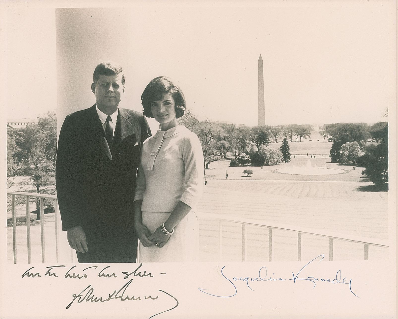 Wonderful matte-finish 10 x 8 photo of the Kennedys posing on the South Portico balcony with the Washington Monument looming in the background, signed in the lower border in blue ballpoint by Jacqueline Kennedy. The JFK signature is in a secretarial hand. In fine condition, with a few small creases touching JFK's face.