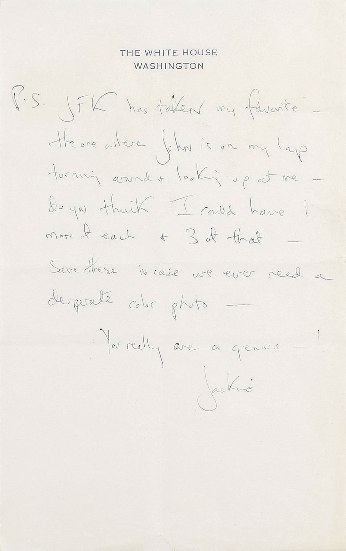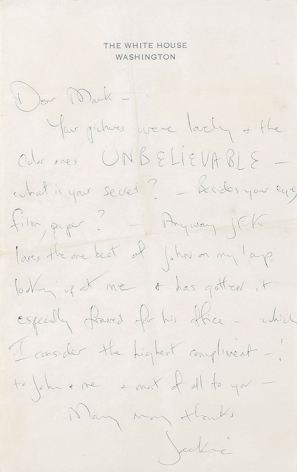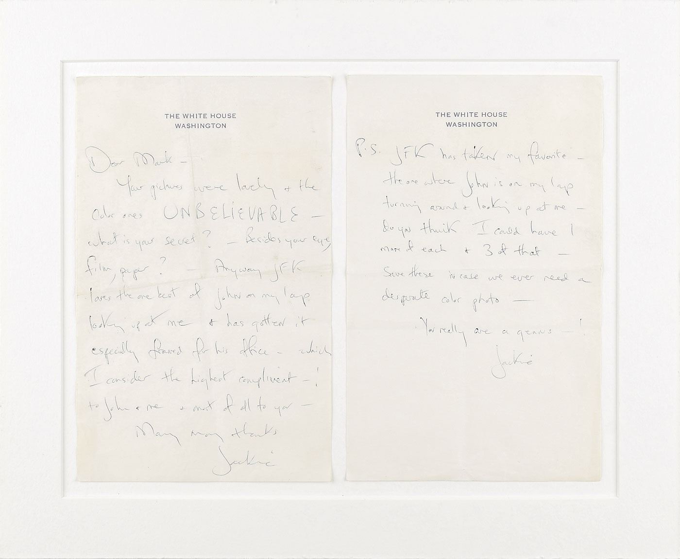 ALS signed “Jackie,” two pages, 5 x 8, White House letterhead, no date. Letter to photographer Mark Shaw, in full: "Your pictures were lovely & the color ones UNBELIEVABLE—what is your secret?—Besides your eye, film, paper?—Anyway, JFK loves the one best of John on my lap looking up at me & has gotten it especially framed for his office—which I consider the highest compliment—to John & me & most of all to you." She adds a postscript on the second page: "JFK has taken my favorite—the one where John is on my lap turning around & looking up at me—do you think I could have 1 more of each & 3 of that—save these in case we ever need a desperate color photo—You really are a genius!" Removably mounted side-by-side and matted to an overall size of 13.5 x 11. In very good condition, with intersecting folds, creasing, and light soiling. Accompanied by Shaw's book The John F. Kennedys: A Family Album, hardcover with dust jacket, published by Farrar, Straus in 1964.