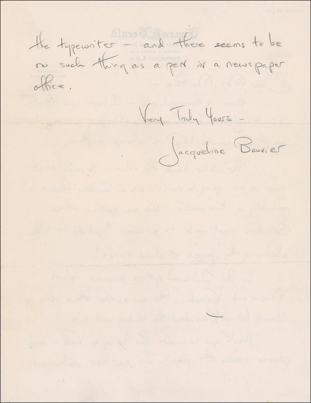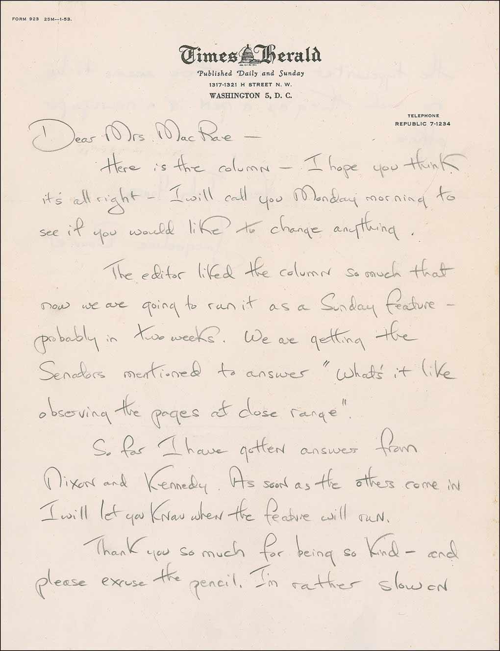 ALS, in pencil, signed “Jacqueline Bouvier,” one page both sides, 8.5 x 11, Times Herald letterhead, no date. Letter to Mrs. MacRae sending a column for publication. In part: “Here is the column—I hope you think it’s all right…The editor liked the column so much that now we are going to run it as a Sunday feature—probably in two weeks. We are getting the Senators mentioned to answer ‘What’s it like observing the pages at close range.’ So far I have gotten answers from Nixon and Kennedy. As soon as the others come in I will let you know when the feature will run. Thank you so much for being so kind—and please excuse the pencil. I’m rather slow on the typewriter—and there seems to be no such thing as a pen in a newspaper office.” In fine condition, with some faint soiling.