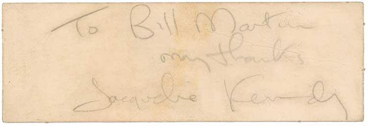 Pencil signature and inscription, “To Bill Martin, my thanks, Jacqueline Kennedy,” on an off-white 5 x 1.75 card. Reverse bears a Charles Hamilton notation of “genuine.” In very good condition, with a bisecting vertical fold, affecting a few letters of signature and inscription, a few other creases, and some scattered light toning and soiling. RRAuction COA.