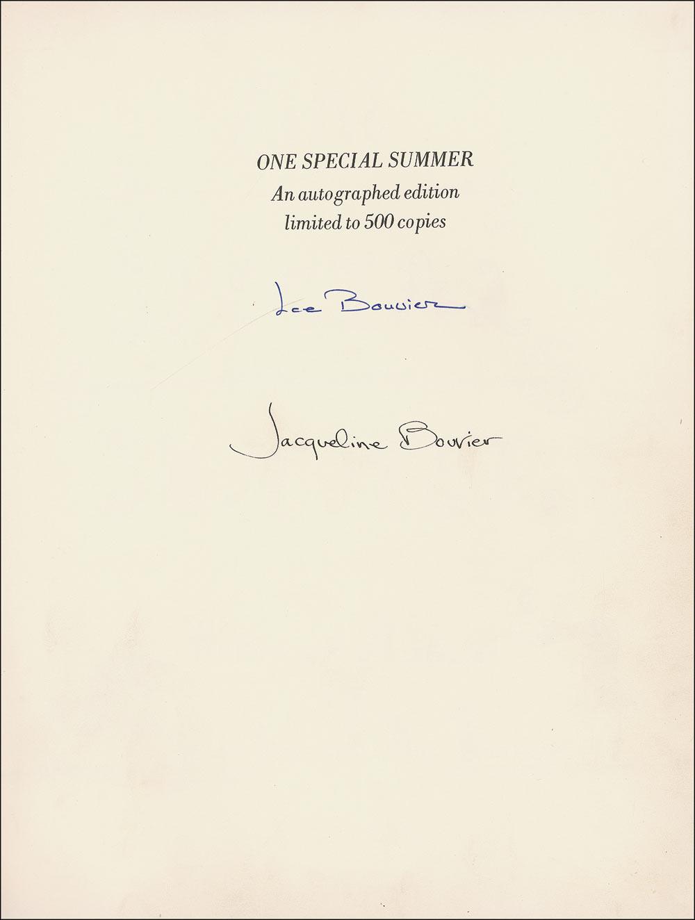 Signed book: One Special Summer. Limited signed first edition of 500 copies. NY: Delacorte Press, 1974. Hardcover, 11 x 13.25, Signed in ink on the limitation page by both “Jacqueline Bouvier” and her sister “Lee Bouvier.” The famous illustrated account of the sisters’ “Grand Tour” during Jackie’s junior year in college, which she spent at the Sorbonne in Paris. Light wear and soiling to covers, vertical tape repair to hinges (which remain intact), and slight wear and small area of paper loss to spine (apparently from removal of library identification), otherwise fine condition. Pre-certified PSA/DNA and RRAuction COA.