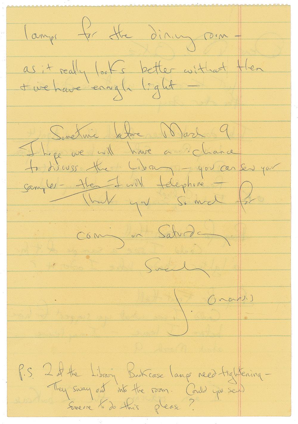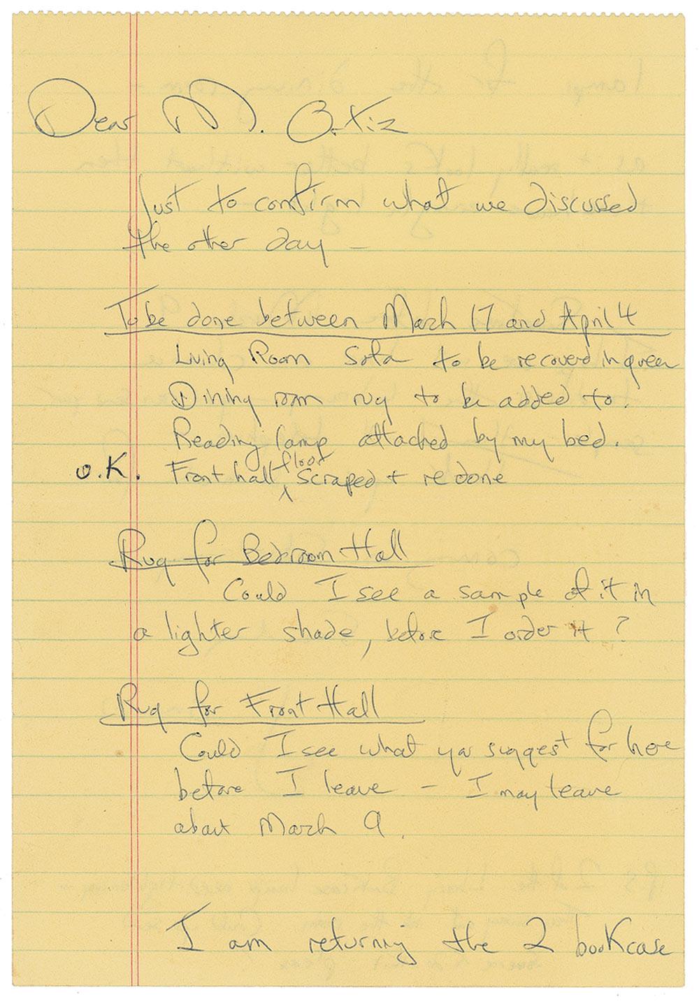 ALS signed “J. Onassis,” one page, lightly-lined both sides, 5 x 7.25, no date. Letter to her interior decorator. In full: “Just to confirm what we discussed the other day. To be done between March 17 and April 4 Living room sofa to be recovered in green Dining Room rug to be added to. Reading lamp attached by my bed. Front hall floor scraped & redone Rug for Bedroom Hall Could I see a sample of it in a lighter shade, before I order it? Rug for Front Hall Could I see what you suggest for here before I leave. I may leave about March 9. I am returning the 2 bookcase lamps for the dining room, as it really looks better without them & we have enough light. Sometime before March 9 I hope we will have a chance to discuss the library. You can send your samples, then I will telephone. Thank you so much for coming on Saturday.” Under her signature she adds: “P.S. 2 of the Library Bookcase lamps need tightening. They sway out into the room. Could you send someone to do this please?" In fine condition.