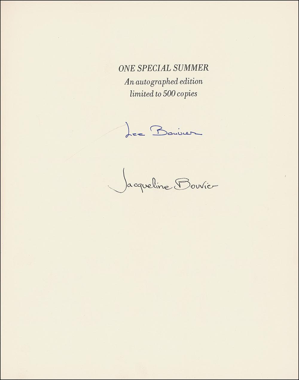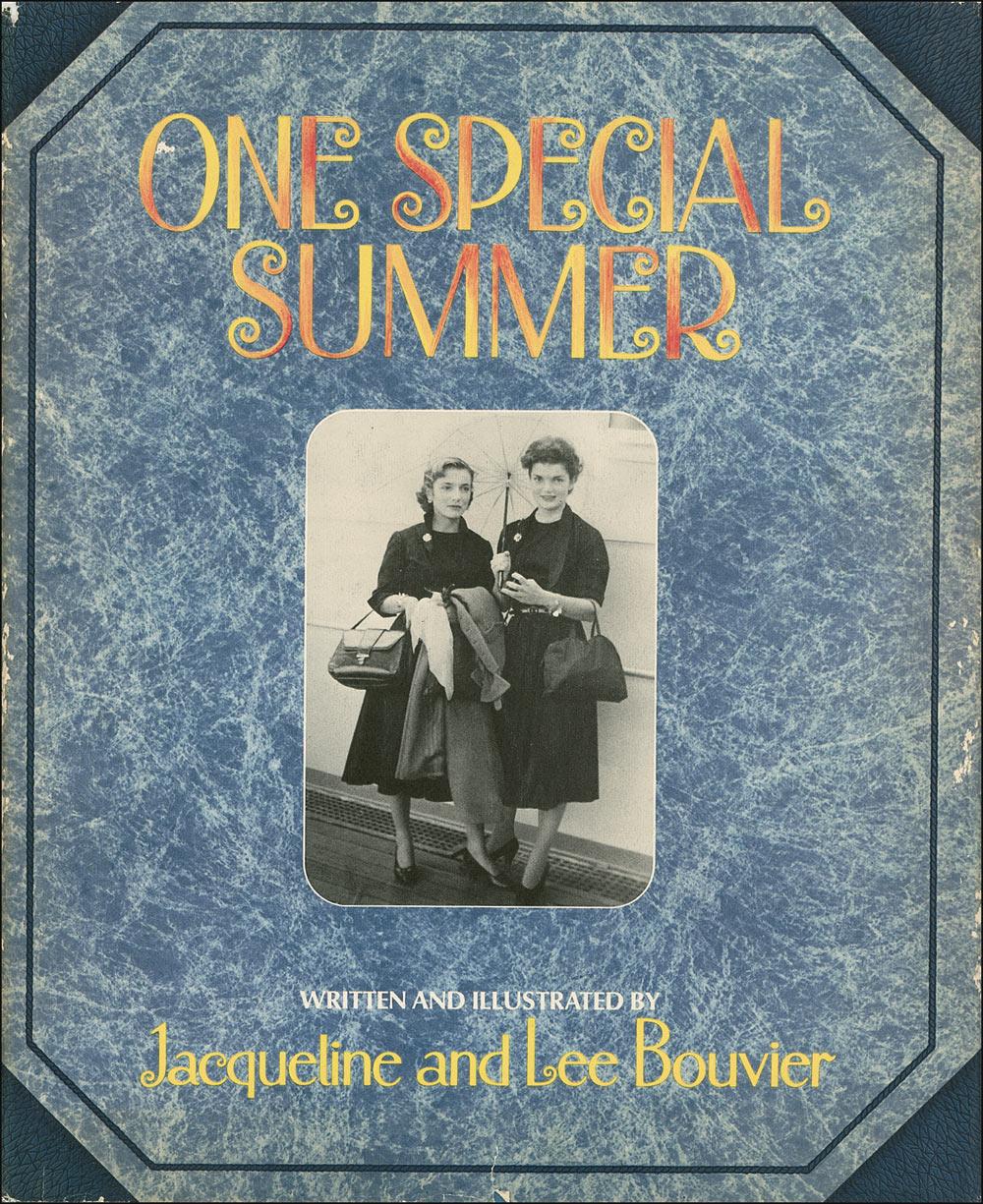 Signed book: One Special Summer. Limited signed first edition of 500 copies. NY: Delacorte Press, 1974. Hardcover in dustjacket, 11 x 13.25, Signed in ink on the limitation page “Jacqueline Bouvier” and “Lee Bouvier.” The famous illustrated account of the sisters’ ‘Grand Tour’ during Jackie’s junior year in college, which she spent at the Sorbonne in Paris. Light wear and a few edge tears to jacket, partial separation to front hinge (which remains intact), and slight toning to spine, otherwise fine, clean condition. Dustjacket shows scattered light toning and small edge tears, as well as some tears and paper loss along spine.