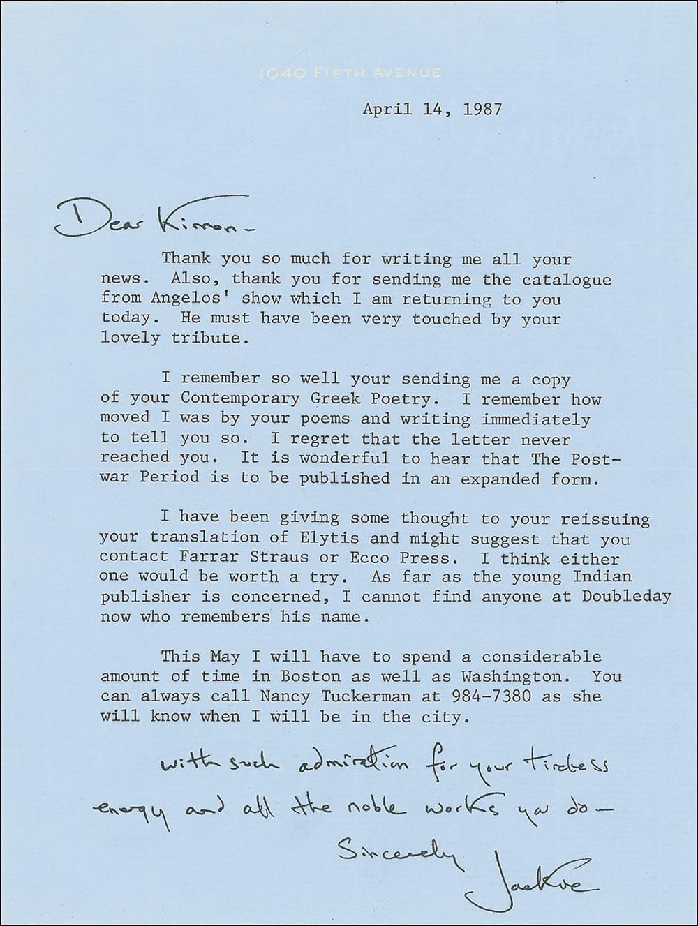 TLS signed “Jackie,” one page, 5.75 x 7.75, personal letterhead, April 14, 1987. Kennedy sends thanks to Kimon Friar, an Athens professor. In part: “I remember so well your sending me a copy of your Contemporary Greek Poetry. I remember how moved I was by your poems and writing immediately to tell you so. I regret that the letter never reached you. It is wonderful to hear that The Post-war Period is to be published in an expanded form. I have been giving some thought to your reissuing your translation of Elytis and might suggest that you contact Farrar Straus or Ecco Press. I think either one would be worth a try. As far as the young Indian publisher is concerned, I cannot find anyone at Doubleday who remembers his name.” Above her signature, Kennedy has added the complimentary closing: “With such admiration for your tireless energy and all the noble works you do.” In fine condition. Accompanied by the original mailing envelope from Doubleday & Company, Inc. in New York City. A fine example of Kennedy’s