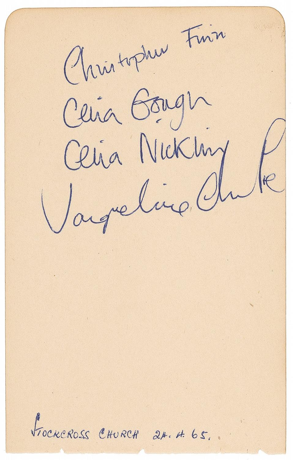 Immensely gifted British cellist (1945–1987) whose brilliant career came to an end when she was stricken with multiple sclerosis at the height of her powers. Her stormy personal and professional life was the subject of the 1998 film Hilary and Jackie. Scarce vintage ballpoint signature, “Jacquline du Pré,” on an off-white 4 x 6.25 album page, also signed by three others and bearing a collector’s notation along bottom reading, “Stockcross Church 24.4.65.” In fine condition.