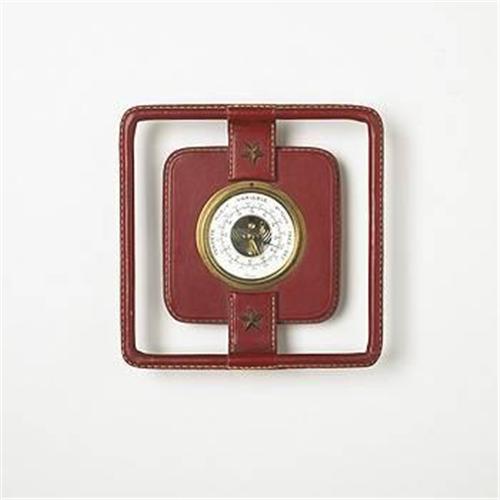 Jacques Adnet barometer Maxant France, c. 1950 leather over steel, brass, glass 11"w x 11"d x 2"h Impressed manufacturer's signature to dial: [maxant]