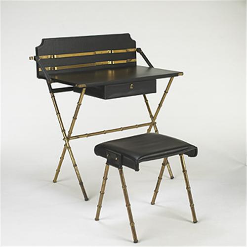 Jacques Adnet desk and stool France, c. 1940 leather over steel, brass 36"w x 22"d x 38.5"h stool: 18"w x 15"d x 18"h