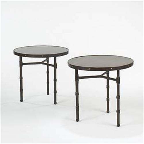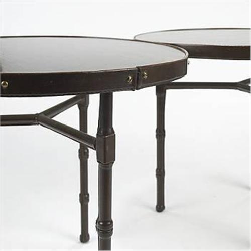 Jacques Adnet side tables, pair France, c. 1950 leather over steel, walnut, brass 25.5"dia x 24"h