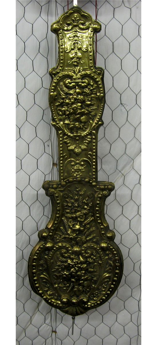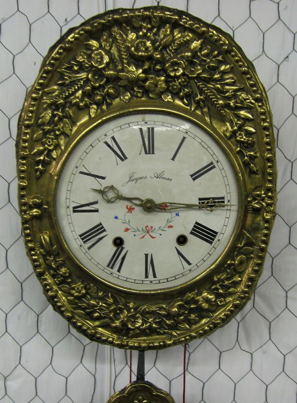 Jacques Almar Mobier Wall Clock, Re-Issue. Beautiful re-issue, large brass wag-on-the-wall weight driven wall clock. The clock face measures 9 1/2'' diameter,18 1/2'' long and 14'' wide. The large pendulum is 42'' long and 12'' wide. Handsome brass embossing work with a porcelain dial. Weights included.