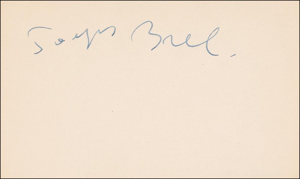 Belgian French-speaking author-composer (1929-1978), considered by many a poet as well, for the strong power of expression in his lyrics. Vintage ink signature, “Jacques Brel,” on an off-white 5 x 3 card. In fine condition, with light uniform toning. Accompanied by an unsigned photo.