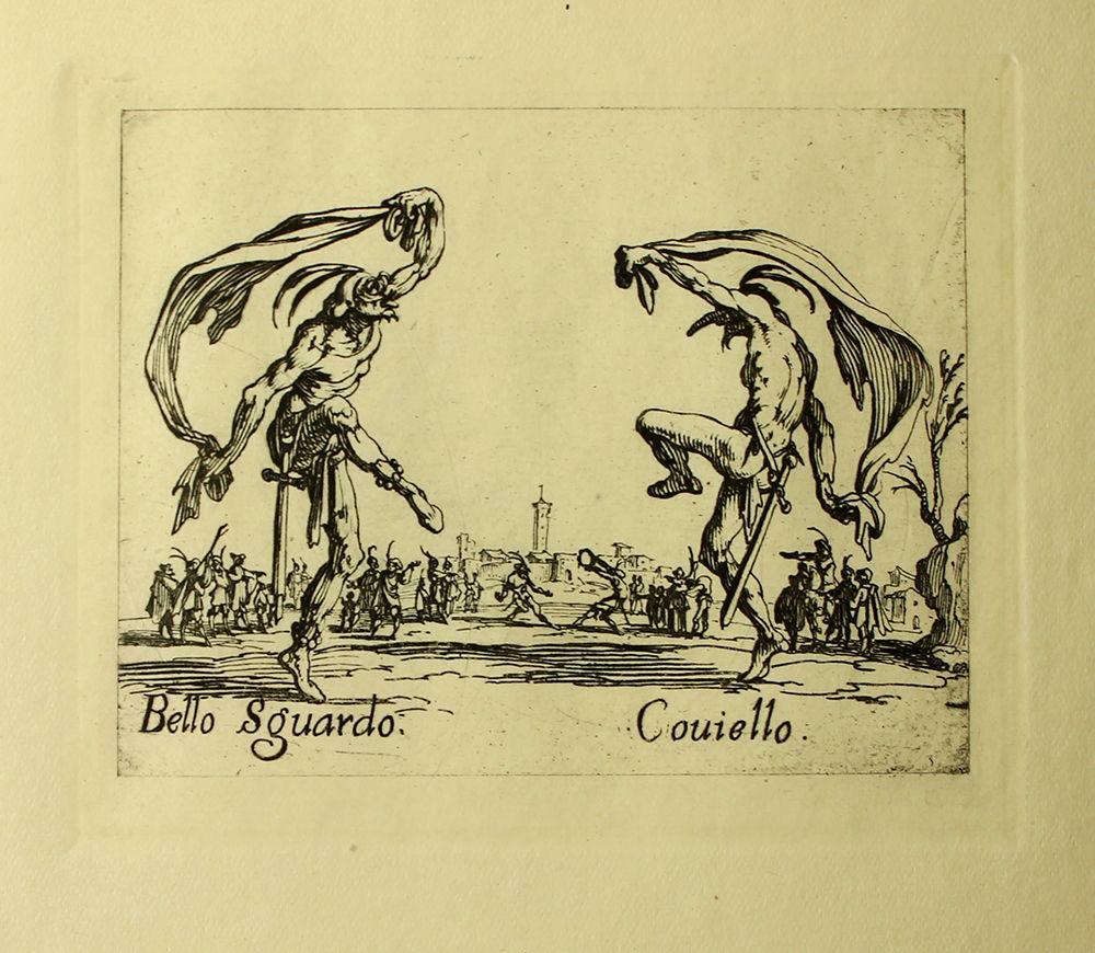 Callot, Jacques. "Bello Sguardo and Couiello" from the Balli Di Sfessania suite of engravings on japon paper after the original created in 1622. Published circa 1920 in a limited edition of only 500 impressions. This is not a modern print. The strike is crisp and the lines are sharp. (Plate Size 3 1/4 x 3 3/4 inches)  Comes with a Certificate of Authenticity.