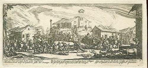 Jacques Callot "Plundering And Burning Of A Village" Etching - Plate 7 From The Jacques Callot Suite "Grandes Misères De La Guerre (Miseries And Misfortunes Of War)" Printed Circa 1730; This Is The Second Edition, The Plates Re-Engraved By Leon Schenck (Originally Issued In Paris, 1633). Size: 3 1/4 X 7 3/8 Inches (Plate) On Laid Paper. - Professionally Framed & Matted - Comes With Certificate - -