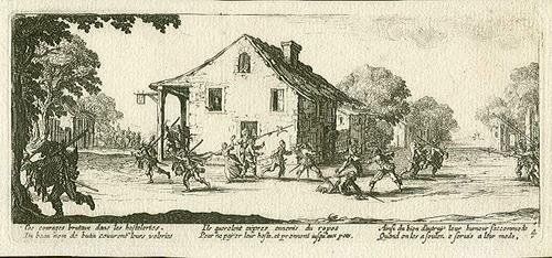 Jacques Callot "Scene Of Pillage" Etching - Plate 4 From The Jacques Callot Suite "Grandes Misères De La Guerre (Miseries And Misfortunes Of War)" Printed Circa 1730; This Is The Second Edition, The Plates Re-Engraved By Leon Schenck (Originally Issued In Paris, 1633). Size: 3 1/4 X 7 3/8 Inches (Plate) On Laid Paper - Professionally Framed & Matted - Comes With Certificate - -