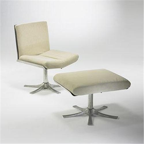 Jacques Charpentier, attribution<BR>chair and ottoman<BR>France, c. 1970<BR>stainless steel, aluminum, upholstery<BR>26.5 w x 26.5 d x 35 h inches<BR>Ottoman measures: 28 w x 22 d x 18 h inches<BR><BR>Condition of the item is not included in this description. Condition reports are available from Wright upon request. Wright strongly recommends that you review a condition report for each item on which you plan to bid.