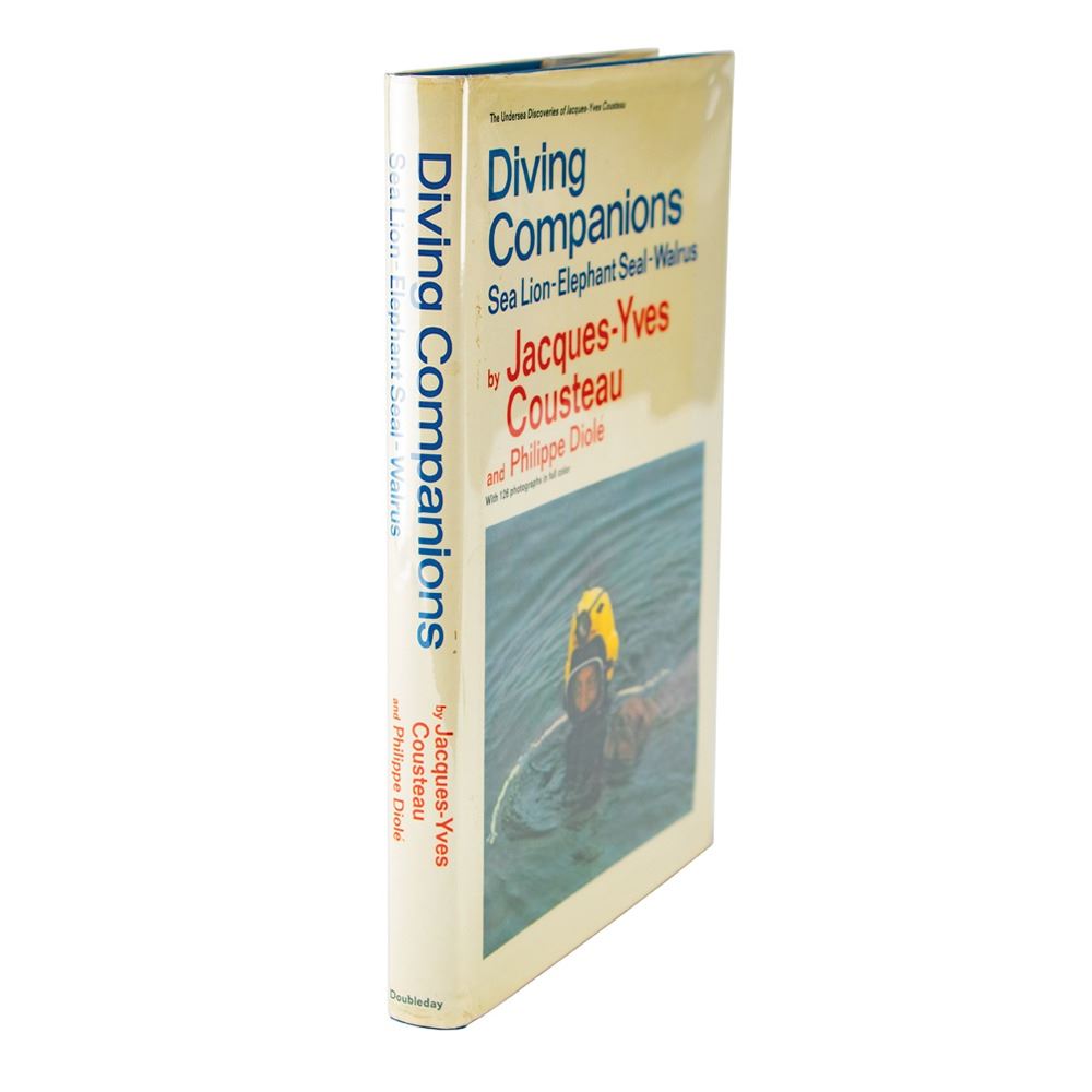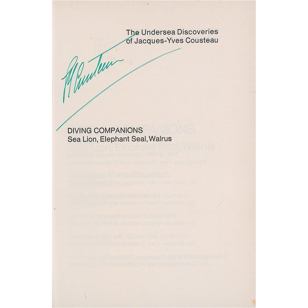 Signed book: Diving Companions: Sea Lion, Elephant Seal, Walrus. Later printing. Garden City, NY: Doubleday, 1974. Hardcover with dust jacket, 7.5 x 10.5, 304 pages. Signed on the half-title page in green felt tip, "J. Y. Cousteau." In fine condition, with creasing to the jacket's front flap.